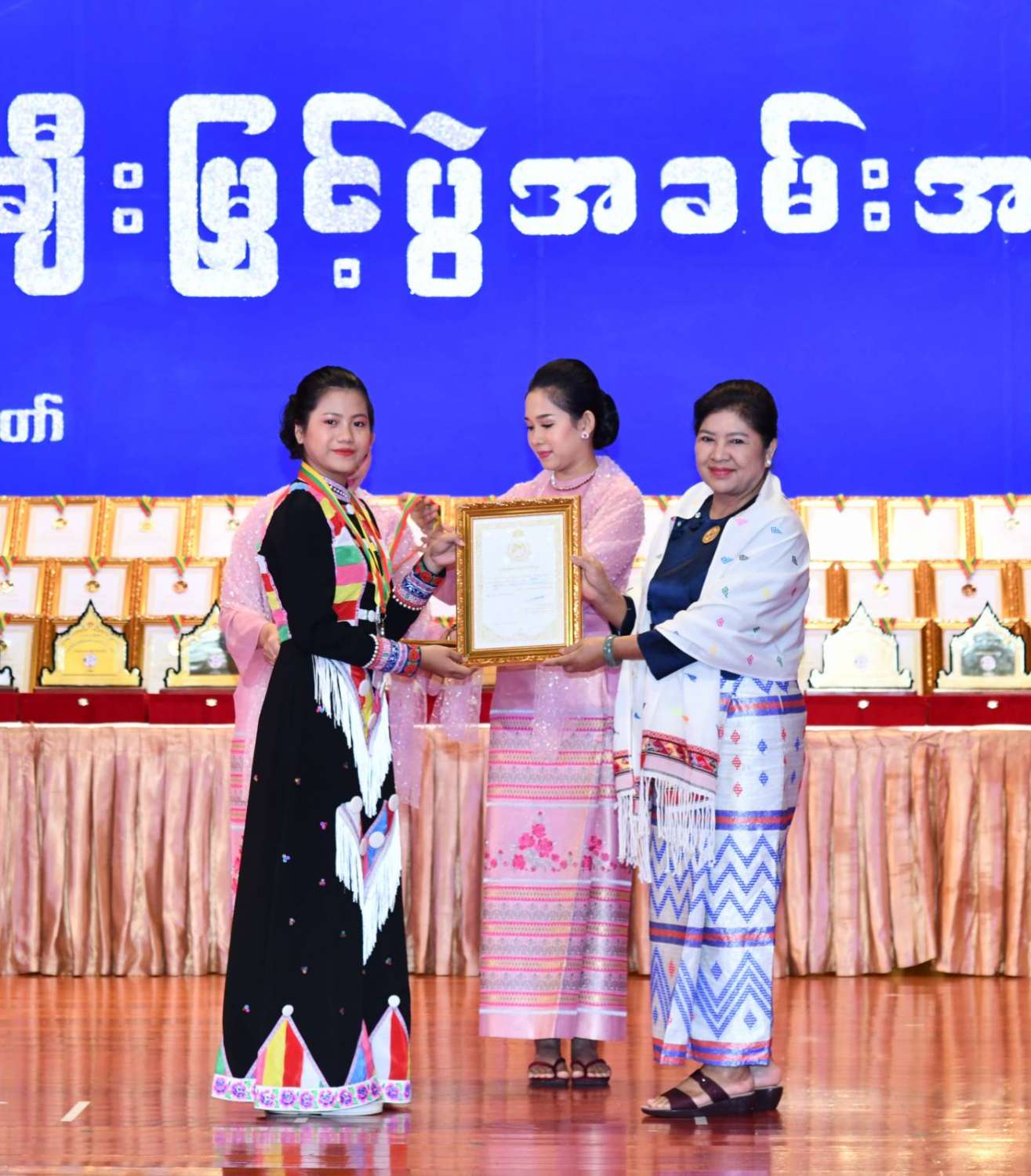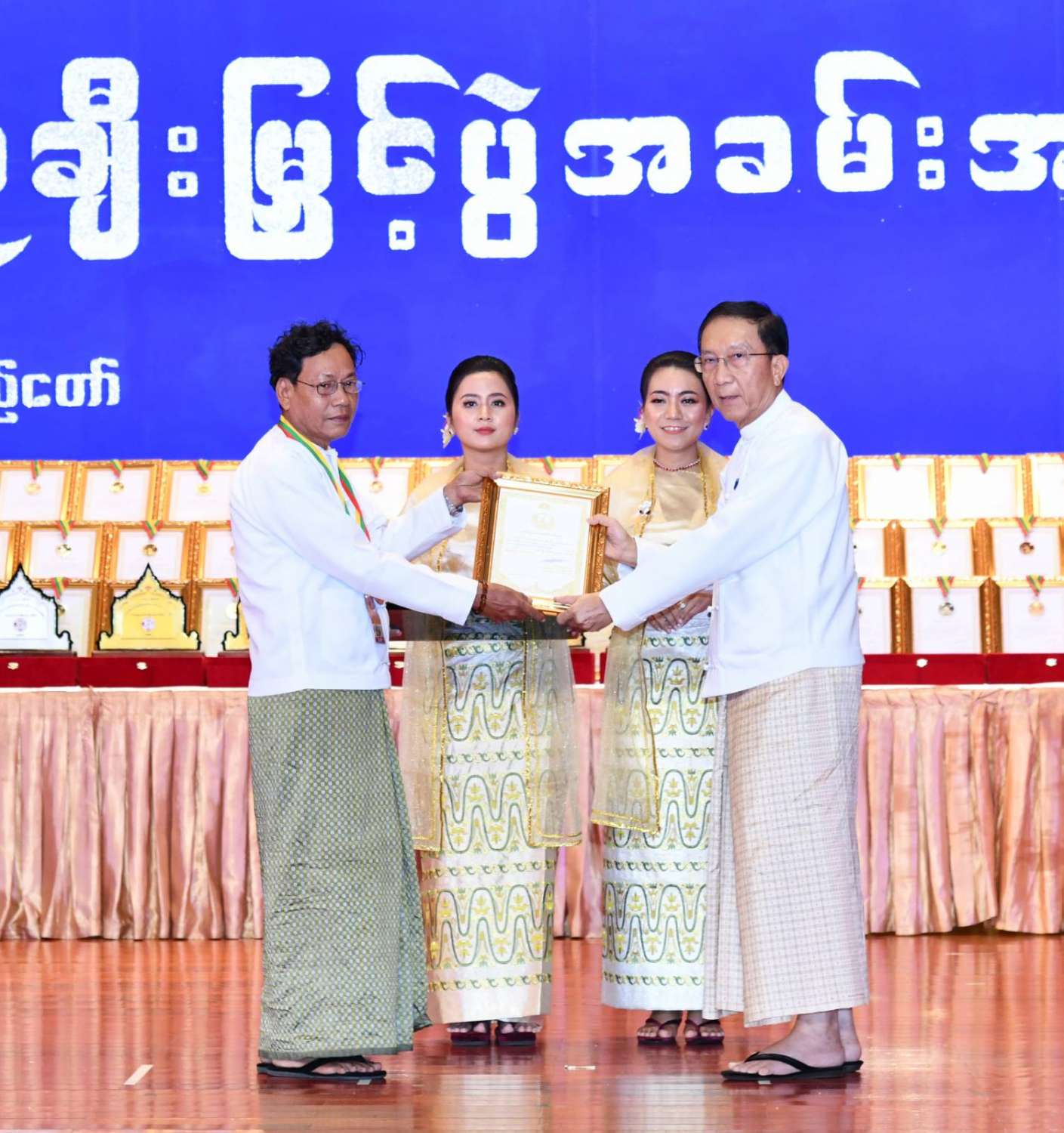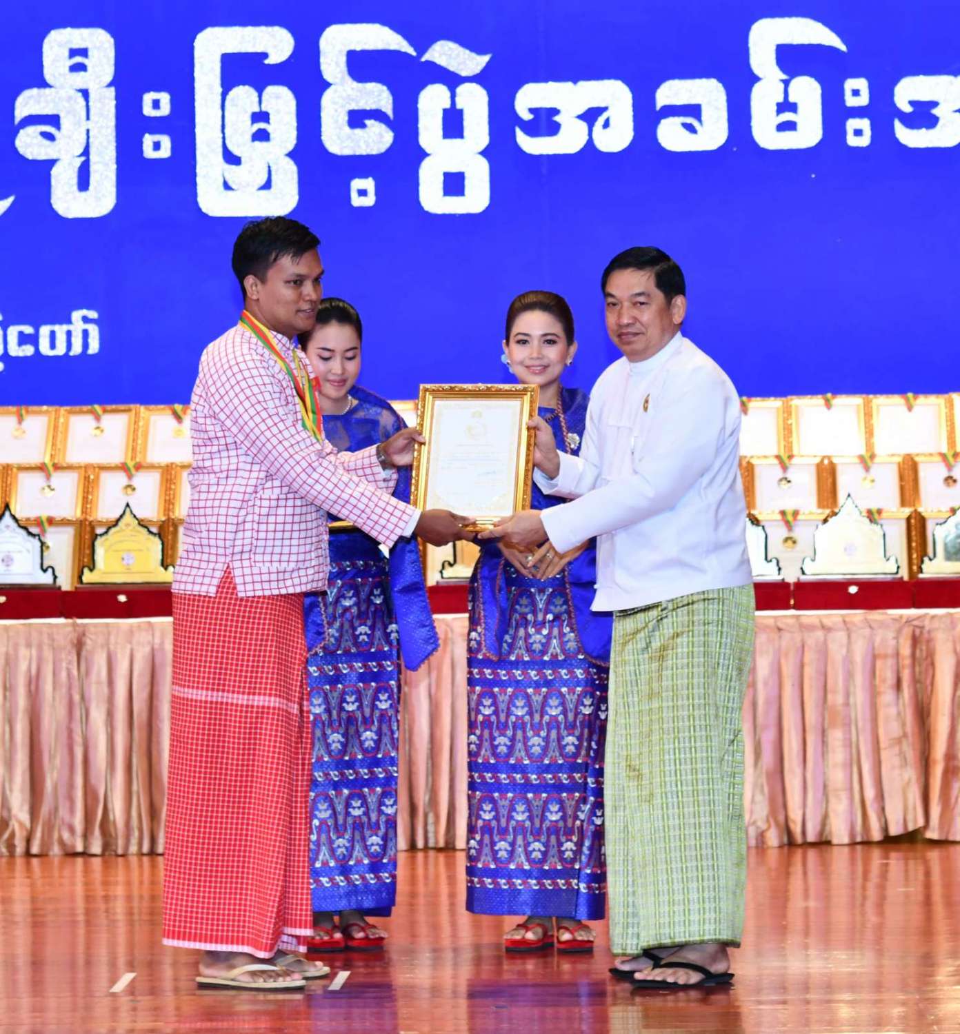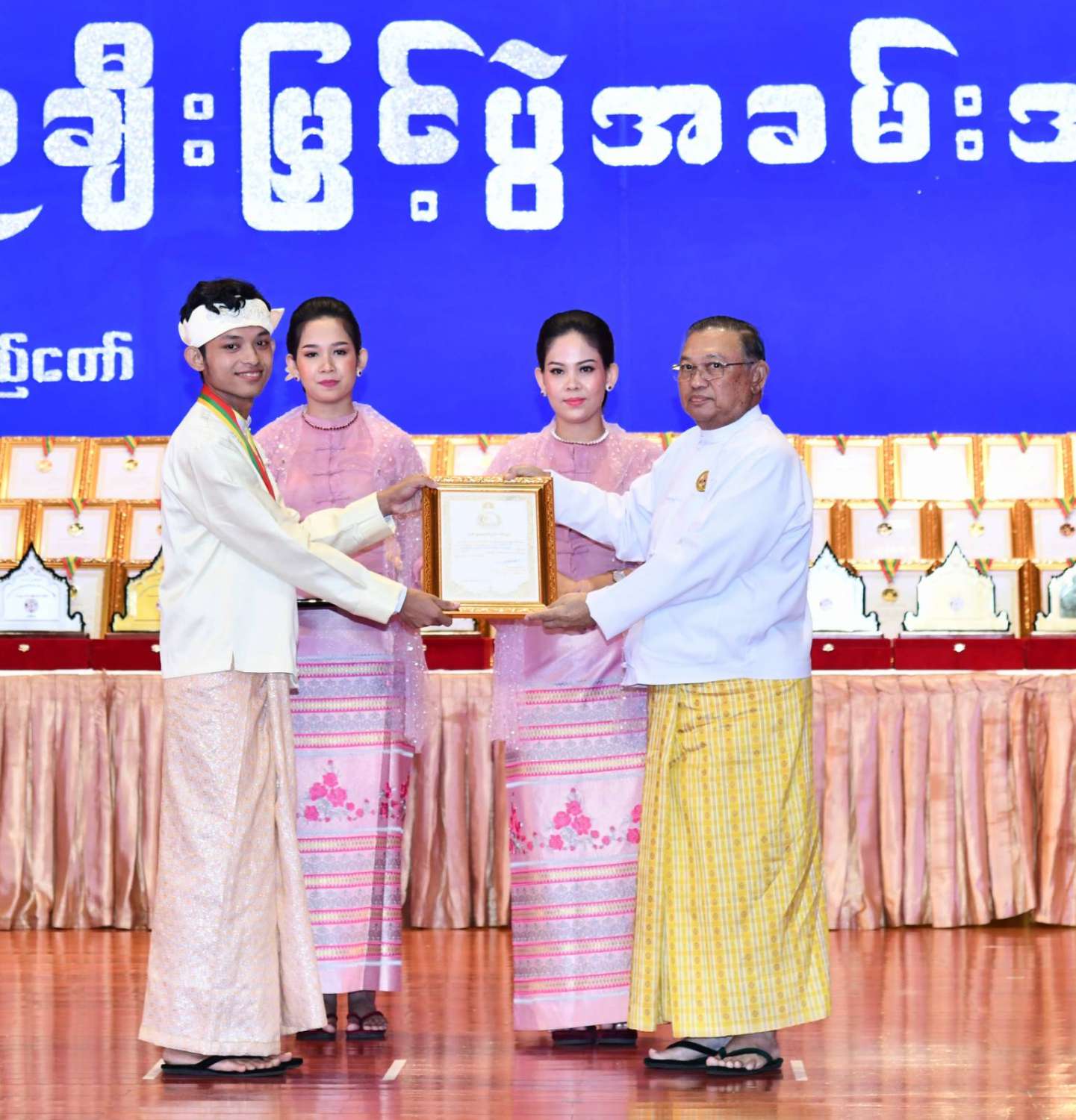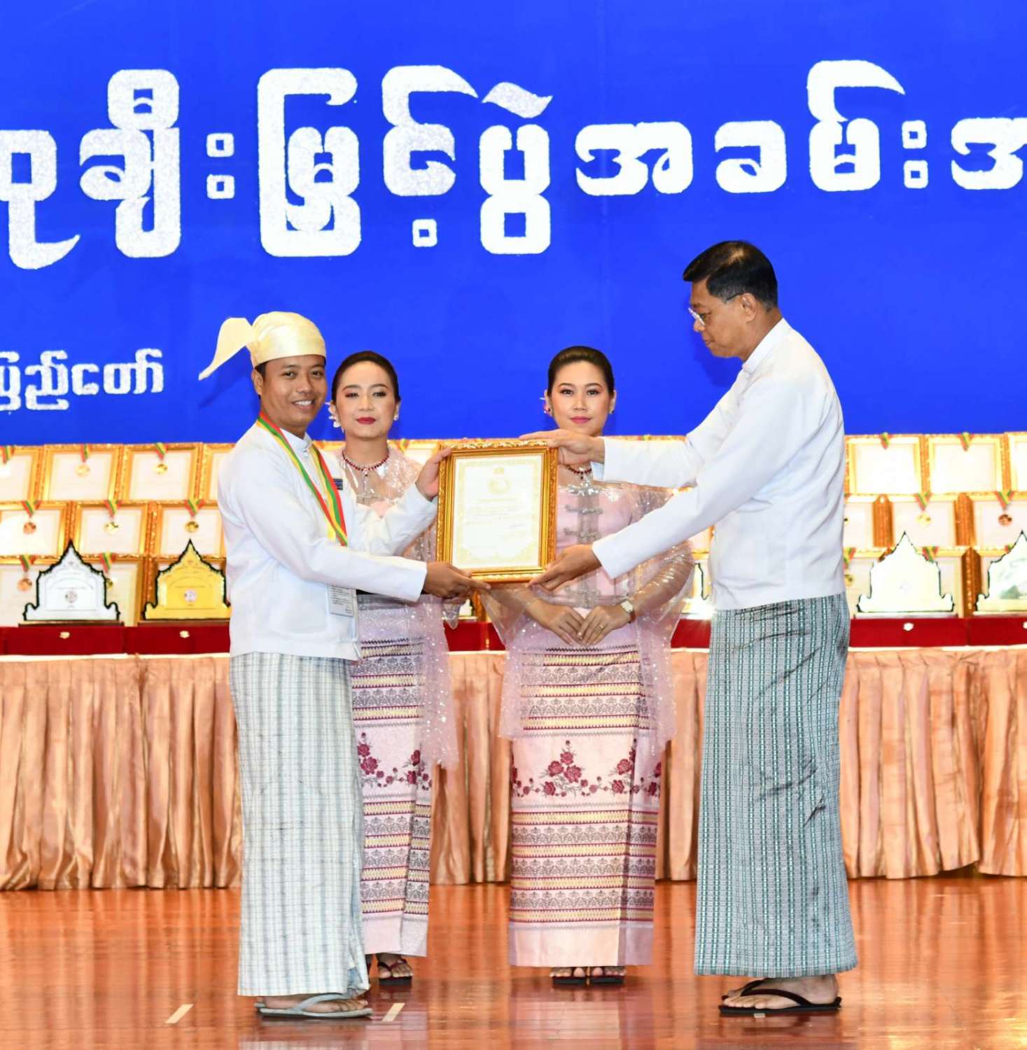 ထို့နောက် ဆုများပေးအပ်ချီးမြှင့်ရာ နိုင်ငံတော်စီမံအုပ်ချုပ်ရေးကောင်စီဥက္ကဋ္ဌ နိုင်ငံတာ်ဝန်ကြီးချုပ်က ကချင်၊ ကယား၊ ကရင်၊ ချင်း၊ မွန်၊ ရခိုင်နှင့် ရှမ်းပြည်နယ်တို့မှ တိုင်းရင်းသားရိုးရာ အကအဖွဲ့များကိုလည်းကောင်း၊ နိုင်ငံတော်စီမံအုပ်ချုပ်ရေးကောင်စီဥက္ကဋ္ဌ နိုင်ငံတာ်ဝန်ကြီးချုပ်၏ ဇနီးက စစ်ကိုင်းတိုင်းဒေသကြီး၊ တနင်္သာရီတိုင်းဒေသကြီး၊ ပဲခူးတိုင်းဒေသကြီး၊ မကွေးတိုင်းဒေသကြီး၊ မန္တလေးတိုင်းဒေသကြီး၊ ရန်ကုန်တိုင်းဒေသကြီးနှင့် ဧရာဝတီတိုင်းဒေသကြီးတို့မှ ကျေးလက်ရိုးရာယဉ်ကျေးမှုအဖွဲ့များကို လည်းကောင်း ဂုဏ်ပြုဆုများ ပေးအပ်ချီးမြှင့်သည်။
