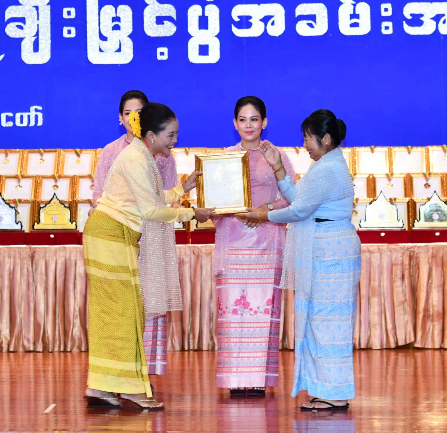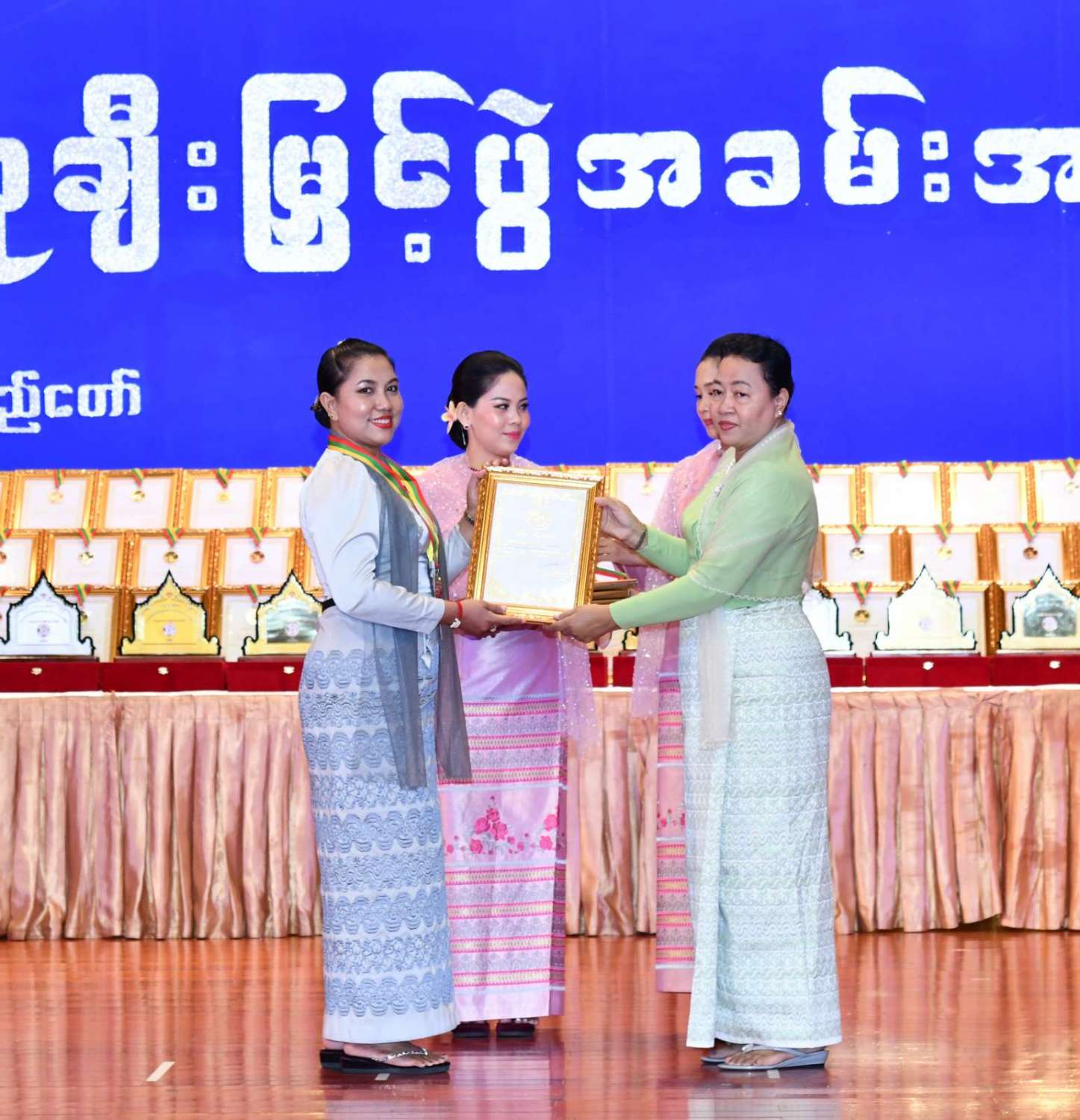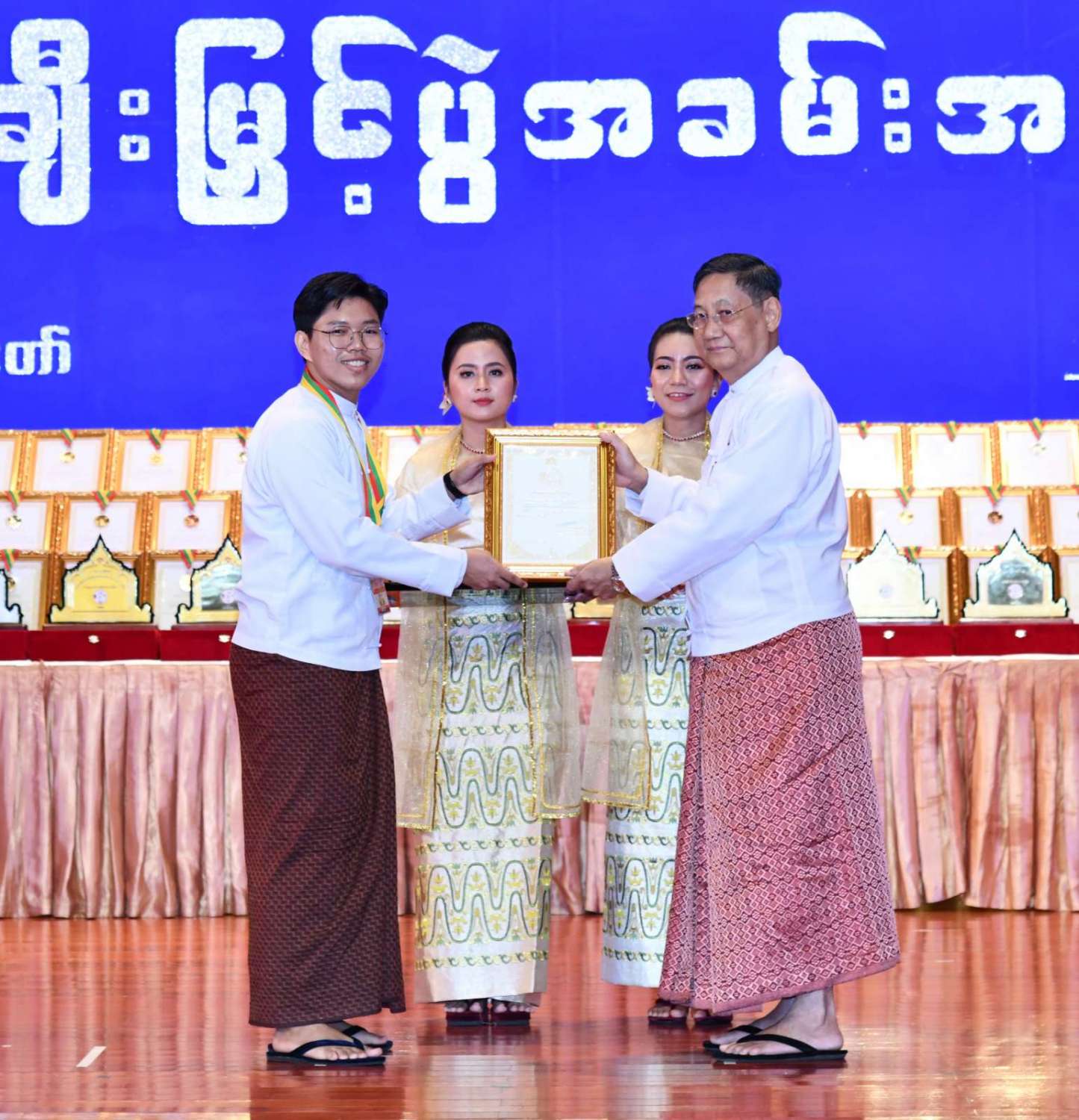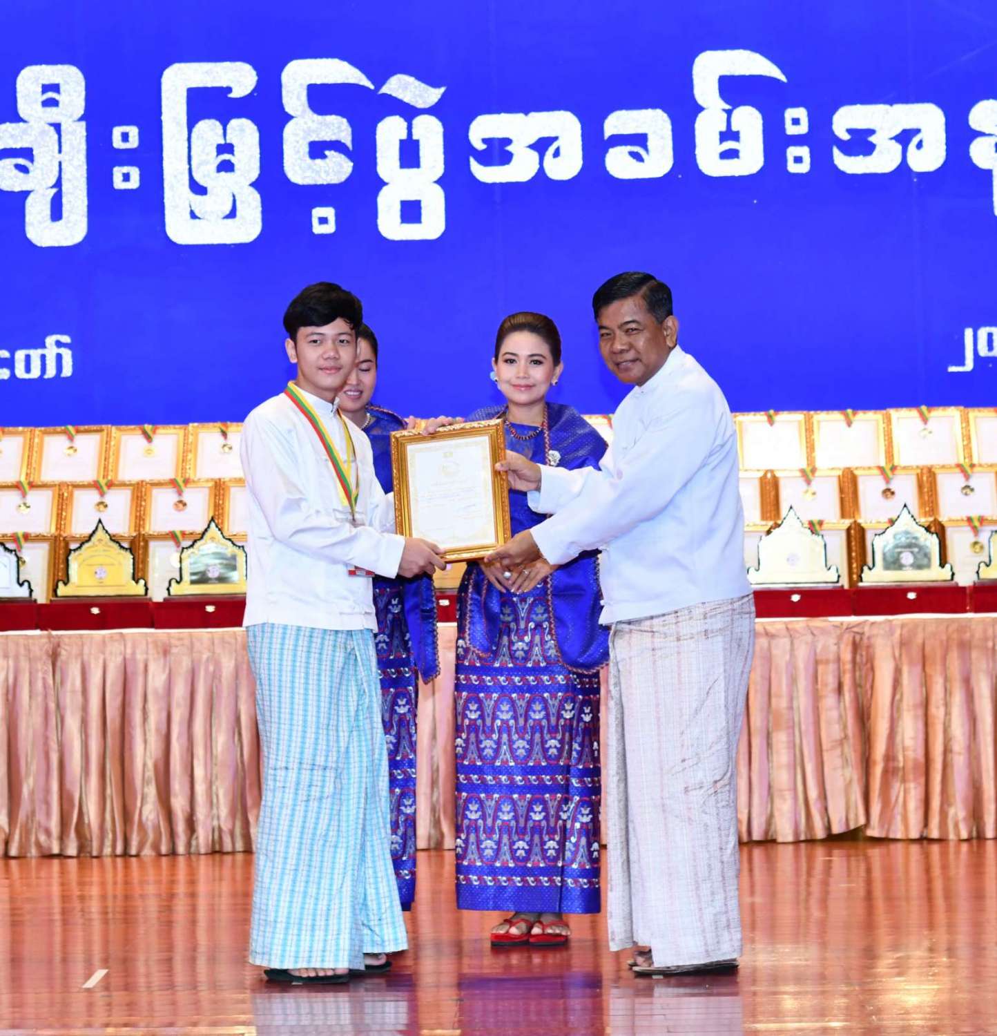 ထို့နောက် ဆုများပေးအပ်ချီးမြှင့်ရာ နိုင်ငံတော်စီမံအုပ်ချုပ်ရေးကောင်စီဥက္ကဋ္ဌ နိုင်ငံတာ်ဝန်ကြီးချုပ်က ကချင်၊ ကယား၊ ကရင်၊ ချင်း၊ မွန်၊ ရခိုင်နှင့် ရှမ်းပြည်နယ်တို့မှ တိုင်းရင်းသားရိုးရာ အကအဖွဲ့များကိုလည်းကောင်း၊ နိုင်ငံတော်စီမံအုပ်ချုပ်ရေးကောင်စီဥက္ကဋ္ဌ နိုင်ငံတာ်ဝန်ကြီးချုပ်၏ ဇနီးက စစ်ကိုင်းတိုင်းဒေသကြီး၊ တနင်္သာရီတိုင်းဒေသကြီး၊ ပဲခူးတိုင်းဒေသကြီး၊ မကွေးတိုင်းဒေသကြီး၊ မန္တလေးတိုင်းဒေသကြီး၊ ရန်ကုန်တိုင်းဒေသကြီးနှင့် ဧရာဝတီတိုင်းဒေသကြီးတို့မှ ကျေးလက်ရိုးရာယဉ်ကျေးမှုအဖွဲ့များကို လည်းကောင်း ဂုဏ်ပြုဆုများ ပေးအပ်ချီးမြှင့်သည်။