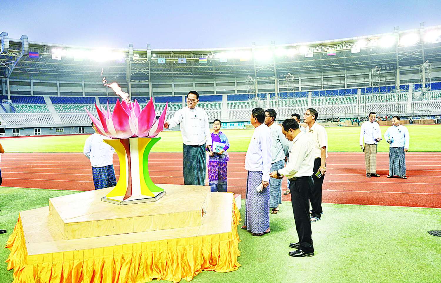 ဦးစွာ ဖွင့်ပွဲ၊ ပိတ်ပွဲ အခမ်းအနားများတွင် အသုံးပြုမည့် Lighting System ၊ LED ၊ အသံ စနစ်နှင့် လျှပ်စစ်မီးများတပ်ဆင်နေမှု၊ စင်မြင့်တည်ဆောက်နေမှု၊ အားကစားကွင်းအတွင်း တိုင်းဒေသကြီးနှင့် ပြည်နယ်အလံများ၊ ဝန်ကြီးဌာနအလိုက် အလံများချိတ်ဆွဲထားရှိမှု၊ ဖျော်ဖြေရေးအဖွဲ့များနှင့် အားကစားသမားများ အဝင်အထွက်ပြုလုပ်မည့်နေရာ လျာထားဆောင်ရွက်နေမှု၊ ကဏ္ဍအလိုက် ဖျော်ဖြေရေးအစီအစဉ်များ ပြင်ဆင်ဆောင်ရွက်နေမှု၊ အလွတ်ခုန်(Free Fall) လေထီးစစ်သည်များက တိုင်းဒေသကြီး၊ ပြည်နယ်အလံများနှင့် အမျိုးသားအားကစားပွဲတော်အလံတို့ကို ကွင်းအတွင်းသို့လေထီးခုန်၍ သယ်ဆောင်လေ့ကျင့်နေမှု၊ ပွဲတော်အထိမ်းအမှတ် မီးရှူးတိုင်လက်ဆင့်ကမ်းသယ်ယူရေး အစီအစဉ်လေ့ကျင့်နေမှု၊ မီးရှူးတိုင်ထွန်းညှိမည့်နေရာ ပြင်ဆင်ဆောင်ရွက်ထားရှိမှုနှင့် ကဏ္ဍအလိုက် ပြင်ဆင်ဆောင်ရွက်နေမှုများကို ကြည့်ရှုစစ်ဆေးကြသည်။