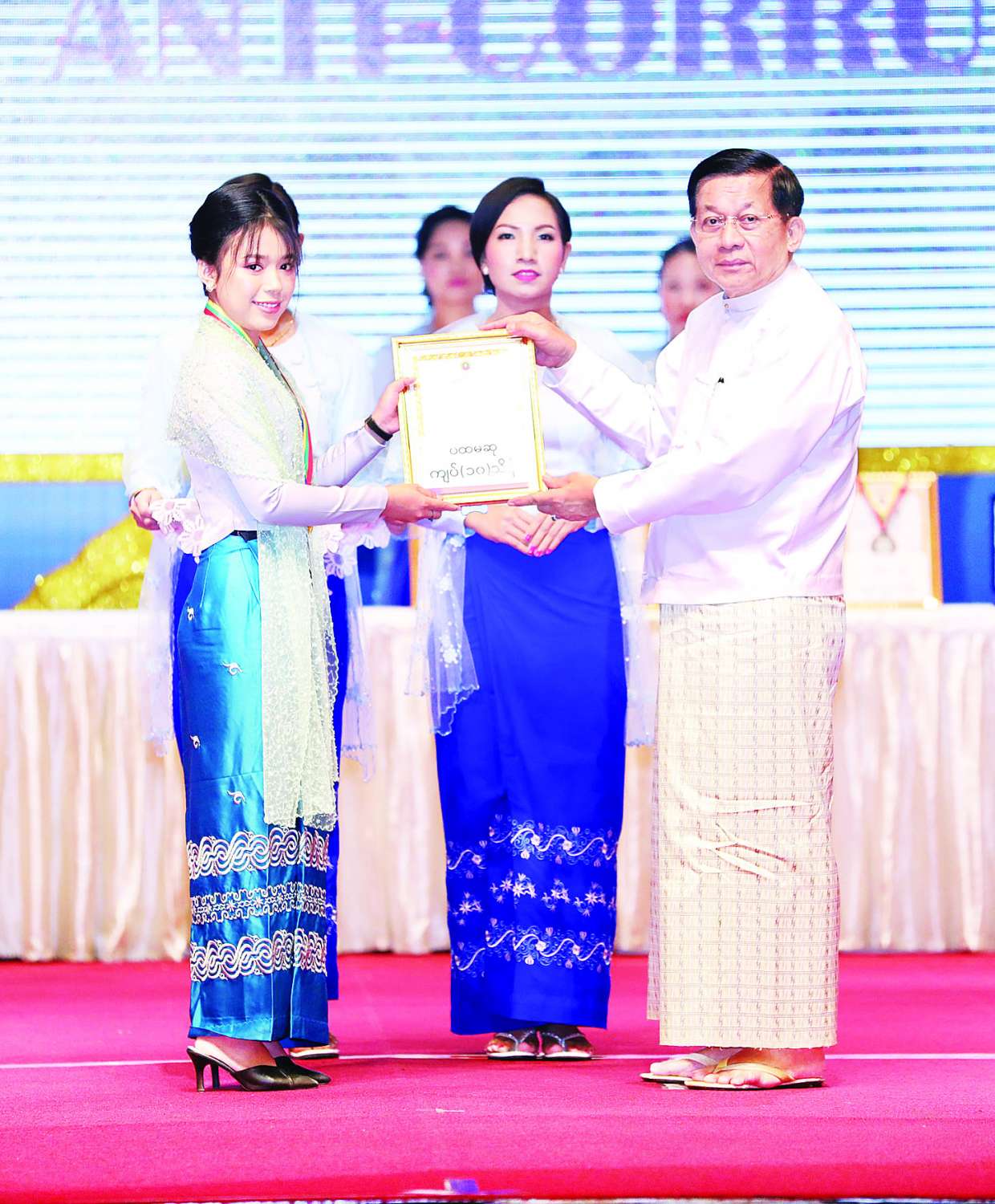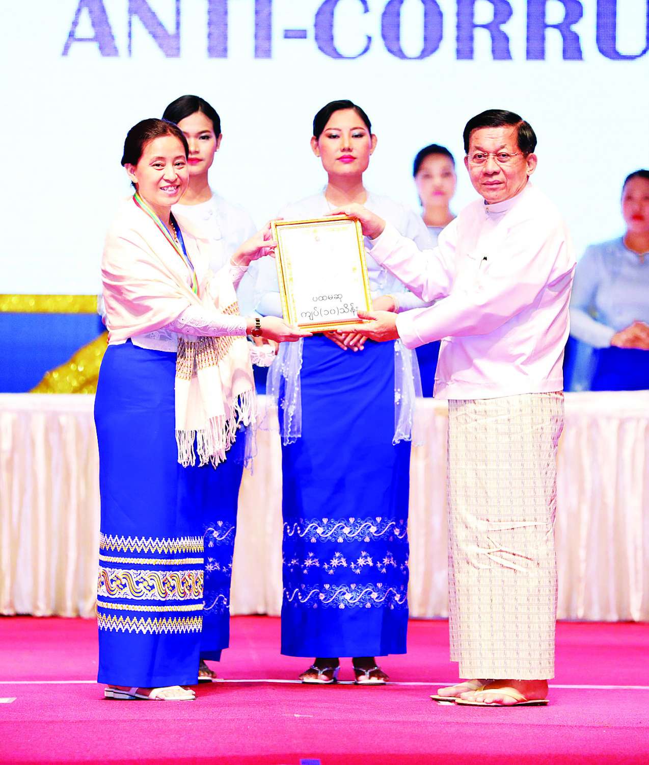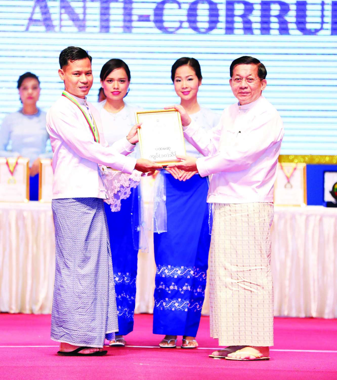 ထို့နောက် နိုင်ငံတော်စီမံအုပ်ချုပ်ရေးကောင်စီဥက္ကဋ္ဌ နိုင်ငံတော်ဝန်ကြီးချုပ်က အဂတိလိုက်စားမှုတိုက်ဖျက်ရေးဆိုင်ရာ ပိုစတာ၊ ဗီဒီယိုနှင့် ဆောင်းပါး ပြိုင်ပွဲတွင် ဆုရရှိခဲ့ကြသူများအား ဆုများပေးအပ်ချီးမြှင့်သည်။
