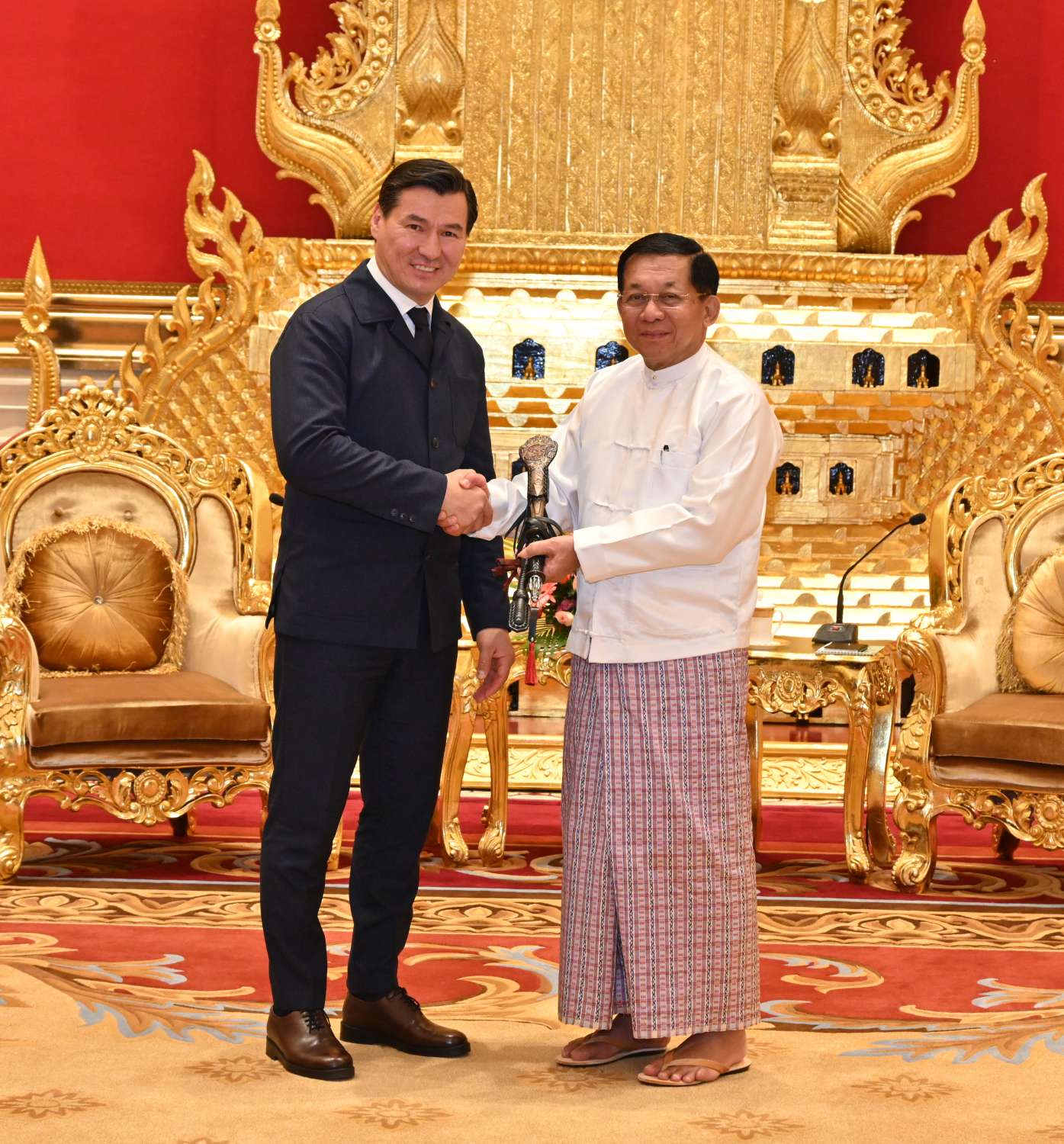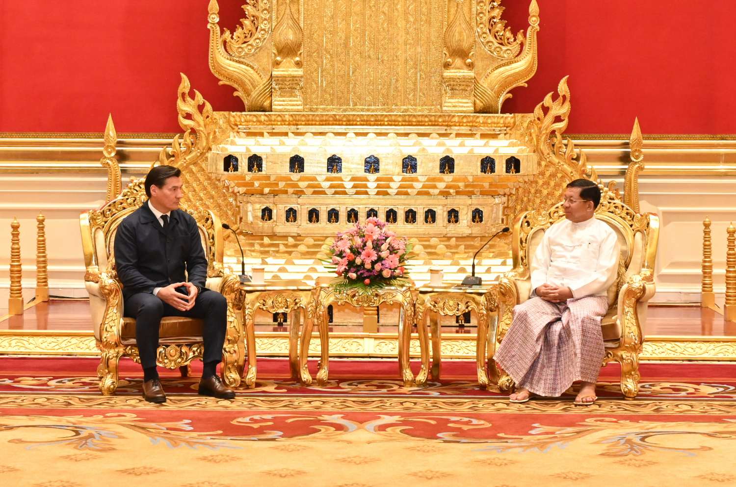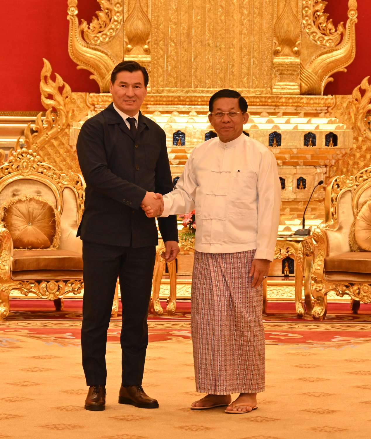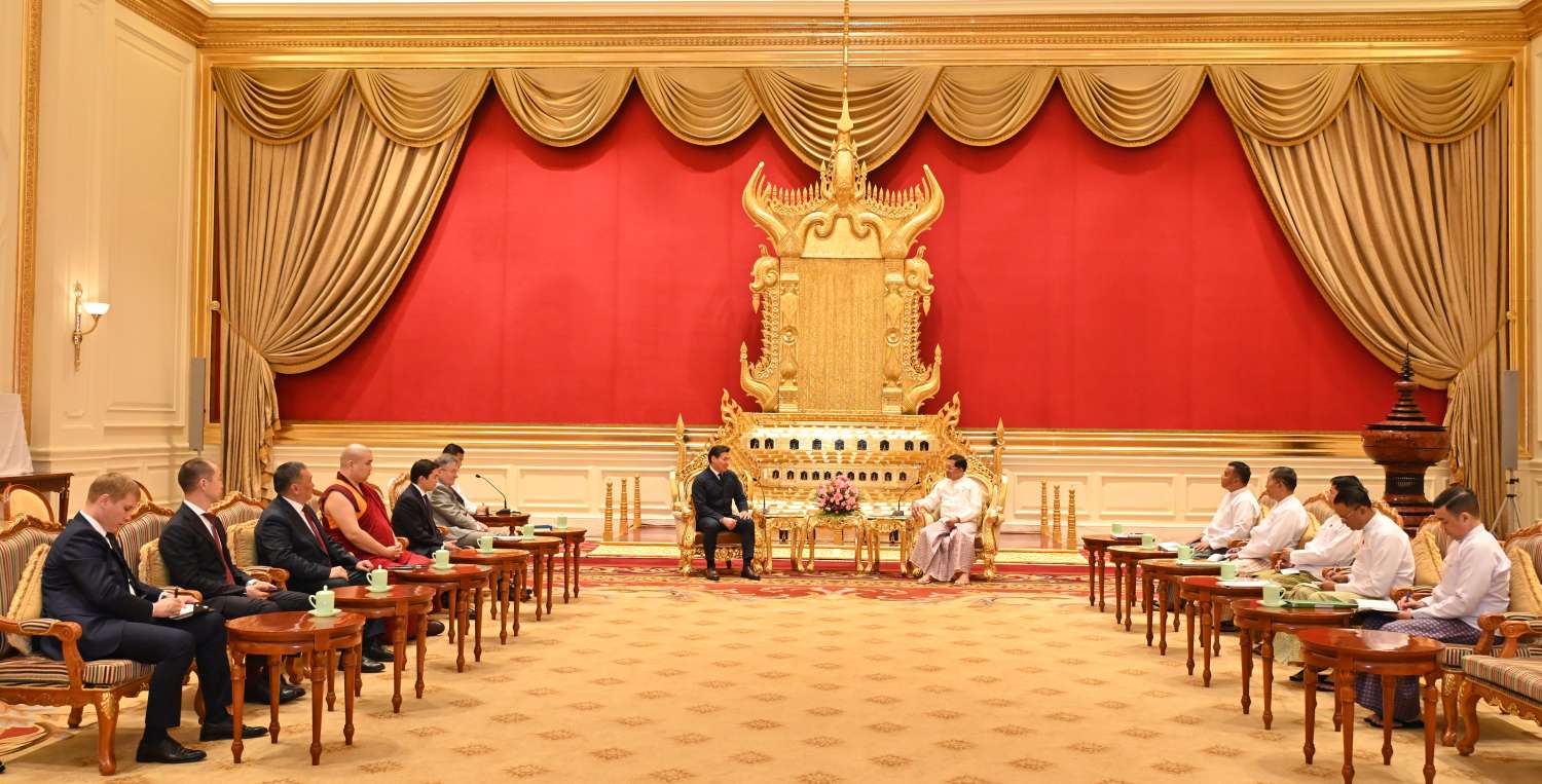 နိုင်ငံတော်စီမံအုပ်ချုပ်ရေးကောင်စီဥက္ကဋ္ဌ နိုင်ငံတော်ဝန်ကြီးချုပ် ဗိုလ်ချုပ်မှူးကြီးမင်းအောင်လှိုင်သည် ရုရှားဖက်ဒရေးရှင်းနိုင်ငံ၊ ကာလ်မီးကီယာပြည်နယ်အကြီးအကဲ H.E. Mr. Batu KHASIKOV ဦးဆောင်သော ကိုယ်စားလှယ်အဖွဲ့အား ယနေ့နံနက်ပိုင်းတွင် နေပြည်တော်ရှိ နိုင်ငံတော်စီမံအုပ်ချုပ်ရေးကောင်စီဥက္ကဋ္ဌရုံး သံတမန်ဆောင်ဧည့်ခန်းမ၌ လက်ခံတွေ့ဆုံသည်။