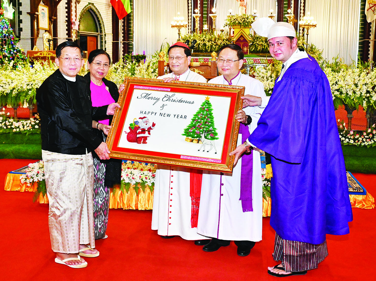 မြန်မာနိုင်ငံခရစ်ယာန်အသင်းတော်ပေါင်းစုံ အဖွဲ့ချုပ်ကြီးများ ကြီးမှူးကျင်းပသည့် ခရစ်တော်မွေးနေ့ (ခရစ္စမတ်) ကျေးဇူးတော်ချီးမွမ်းခြင်းနှင့် မိတ်သဟာယညစာစားပွဲအခမ်းအနားကို ယနေ့ညနေပိုင်းတွင် ရန်ကုန်တိုင်းဒေသကြီး၊ ဗိုလ်တထောင်မြို့နယ်ရှိ St. Mary’s Cathedral Church ၌ ကျင်းပပြုလုပ်ရာ နိုင်ငံတော်စီမံအုပ်ချုပ်ရေးကောင်စီဥက္ကဋ္ဌ နိုင်ငံတော်ဝန်ကြီးချုပ် ဗိုလ်ချုပ်မှူးကြီးမင်းအောင်လှိုင်တက်ရောက်ချီးမြှင့်သည်။
