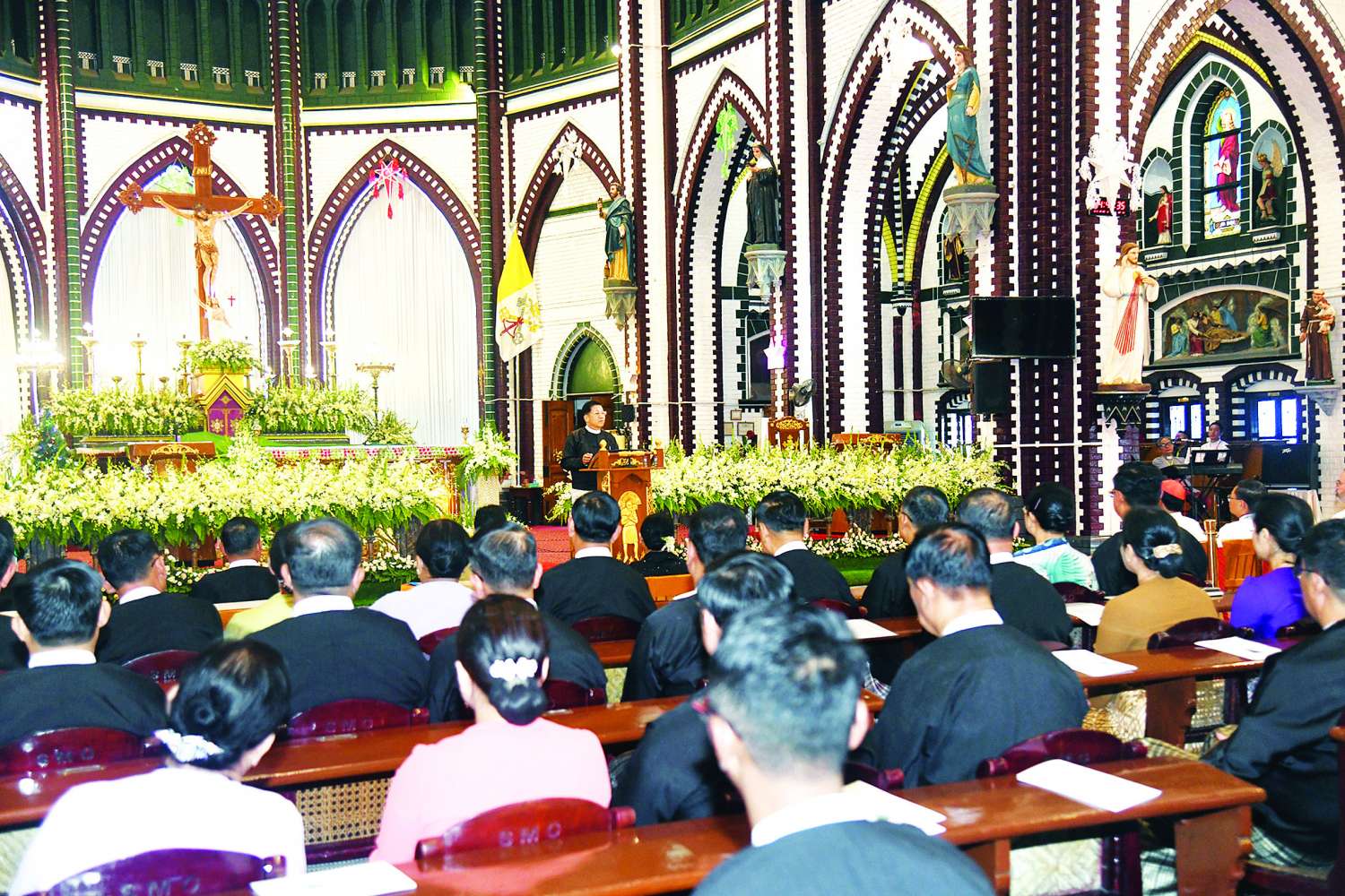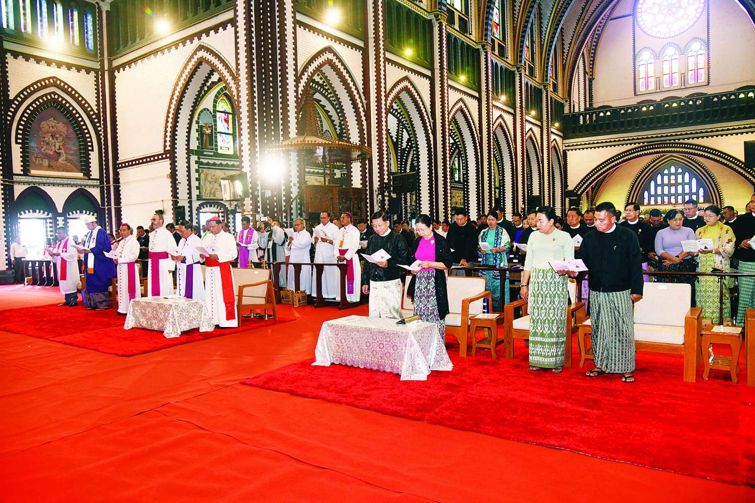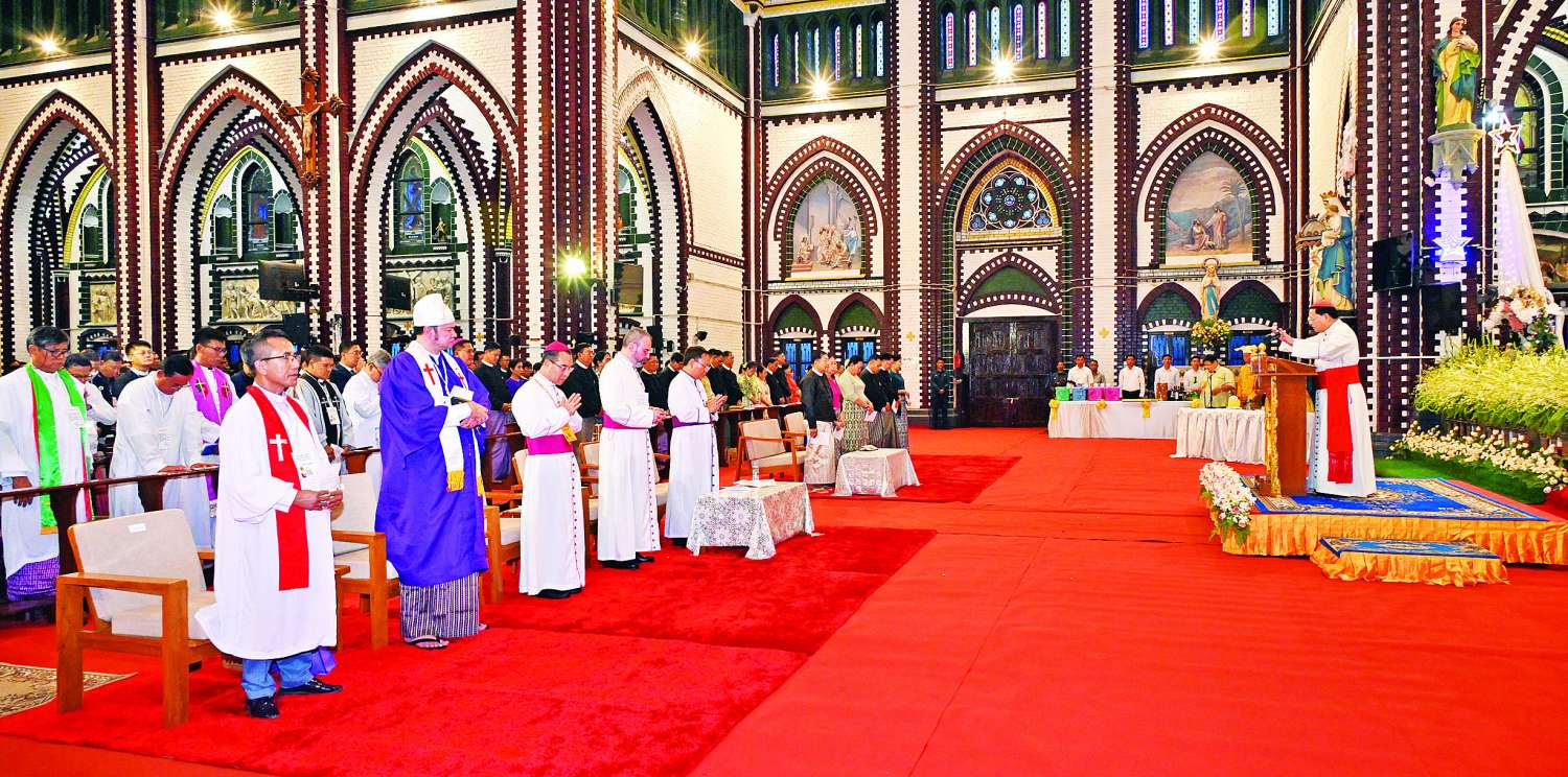 ဦးစွာ နိုင်ငံတော်စီမံအုပ်ချုပ်ရေးကောင်စီဥက္ကဋ္ဌ နိုင်ငံတော်ဝန်ကြီးချုပ်နှင့်ဇနီး၊ အဖွဲ့ဝင်များသည် St. Mary’s Cathedral Church သို့ ရောက်ရှိကြရာ ကက်သလစ်ဂိုဏ်းချုပ်သာသနာ၊ ဂိုဏ်းချုပ်ဆရာတော်ကြီး ကာဒီနယ်ချားလ်စ်ဘိုနှင့် သင်းအုပ်ဆရာကြီးများက ကြိုဆိုနှုတ်ဆက်ကြသည်။ ယင်းနောက် အခမ်းအနားကိုစတင်ကျင်းပရာ သိက္ခာတော်ရဆရာမျိုးမြင့်ဦးက အဖွင့်ဆုတောင်းပြီး သာသနာပိုင်ချုပ်ကြီး စတီဗင်သန်းမြင့်ဦးက ကြိုဆိုနှုတ်ခွန်းဆက်စကားပြောကြားသည်။