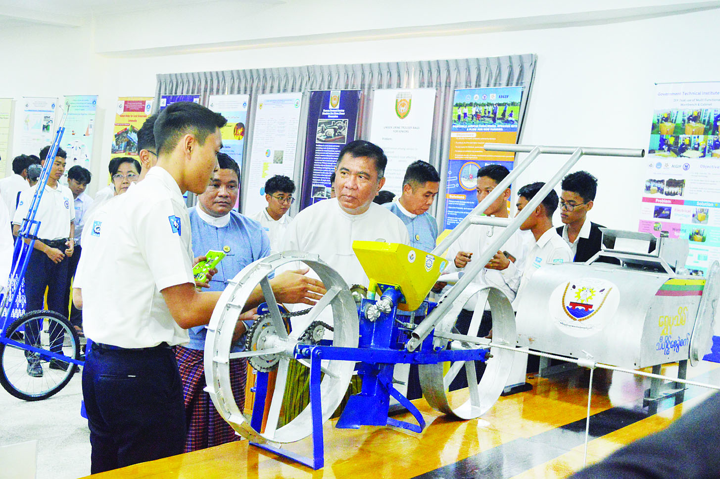 ထို့နောက် သိပ္ပံနှင့်နည်းပညာဝန်ကြီးဌာန ပြည်ထောင်စုဝန်ကြီး ဒေါက်တာမျိုးသိန်းကျော်နှင့် တာဝန်ရှိသူများသည် တက္ကသိုလ်များ၊ အစိုးရစက်မှုလက်မှုသိပ္ပံများနှင့် အစိုးရနည်းပညာအထက်တန်းကျောင်းတို့မှ ကျောင်းသား ကျောင်းသူများ၏ ဆန်းသစ်တီထွင်မှုပရောဂျက်များ ယှဉ်ပြိုင်နေမှုကို ကြည့်ရှုအားပေးကြသည်။