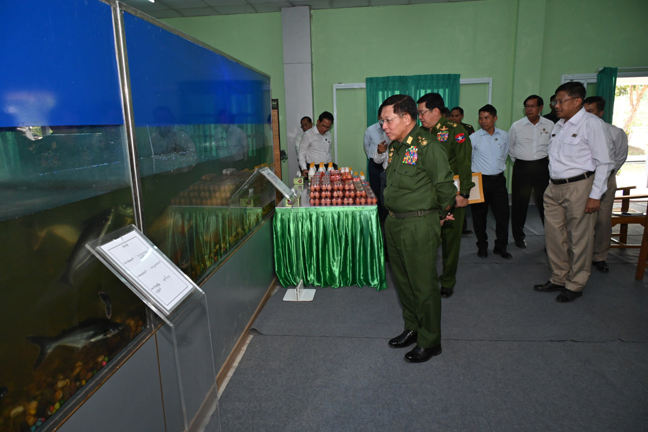 ထို့နောက် နိုင်ငံတော်စီမံအုပ်ချုပ်ရေးကောင်စီဥက္ကဋ္ဌ တပ်မတော်ကာကွယ်ရေးဦးစီးချုပ်နှင့် အဖွဲ့ဝင်များသည် သီလဝါဘက်စုံစိုက်ပျိုးမွေးမြူရေးဇုန်တွင် မွေးမြူထားရှိသည့် ငါး အမျိုးအစားနမူနာပြသထားရှိမှုများနှင့် စိုက်ပျိုးမွေးမြူရေးလုပ်ငန်းများမှ ထွက်ရှိသည့် ကြက်ဥ၊ ဘဲဥ၊ နို့ထွက်ပစ္စည်းများ ခင်းကျင်းပြသထားမှုများကို ကြည့်ရှုသည်။