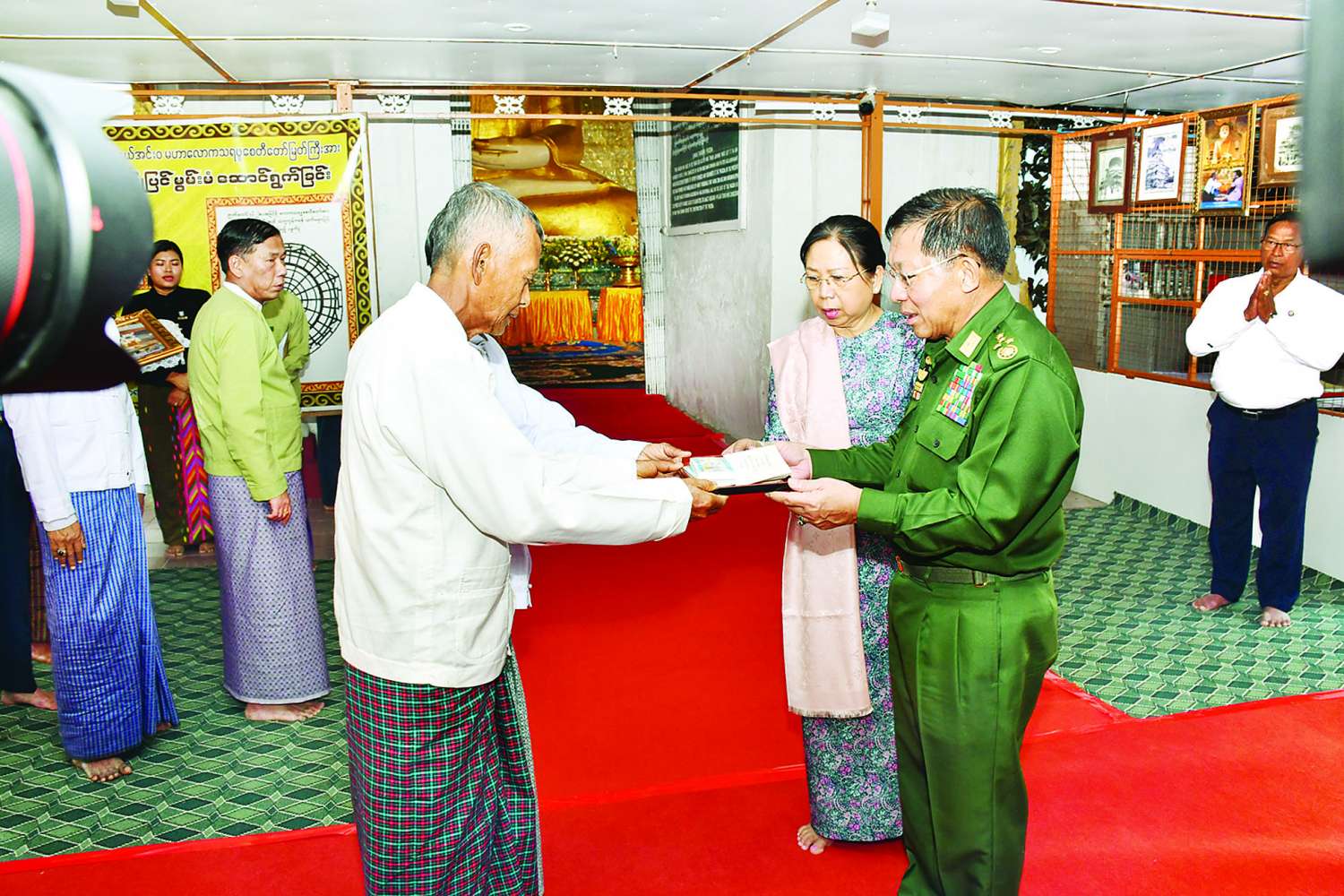 ယင်းနောက် နိုင်ငံတော်စီမံအုပ်ချုပ်ရေးကောင်စီဥက္ကဋ္ဌ နိုင်ငံတော်ဝန်ကြီးချုပ်သည် ဘုရားကြီး ဧည့်သည်တော်မှတ်တမ်းစာအုပ်တွင် လက်မှတ်ရေးထိုးပူဇော်ပြီး နိုင်ငံတော်စီမံအုပ်ချုပ်ရေးကောင်စီဥက္ကဋ္ဌ နိုင်ငံတော်ဝန်ကြီးချုပ်နှင့် ဇနီးတို့က ဘုရားကြီးအတွက် ဘက်စုံအလှူတော်ငွေများကို ပေးအပ်လှူဒါန်းရာ ဂေါပကအဖွဲ့ဝင်များက လက်ခံရယူပြီး ဓမ္မလက်ဆောင်များ ပြန်လည်ပေးအပ်သည်။