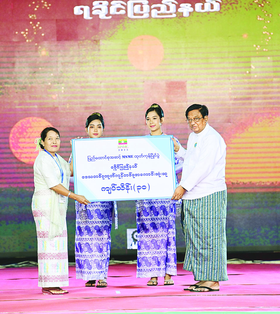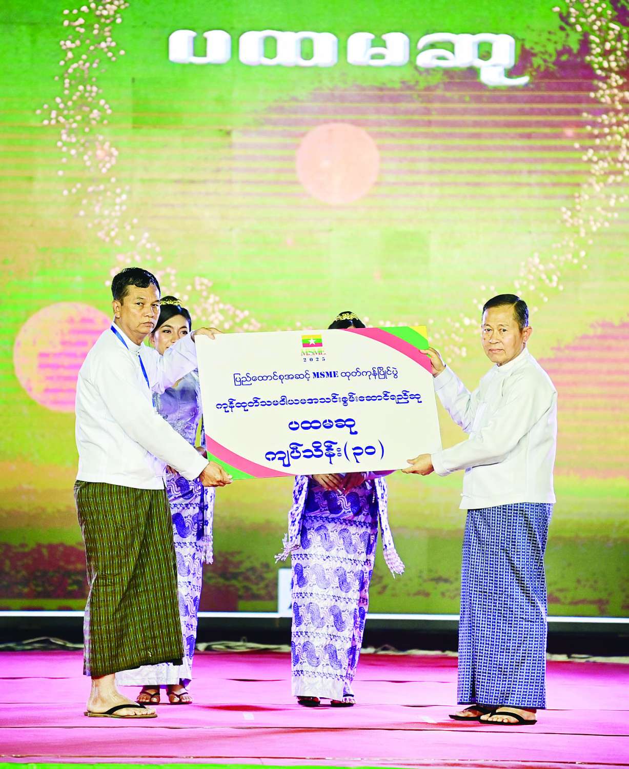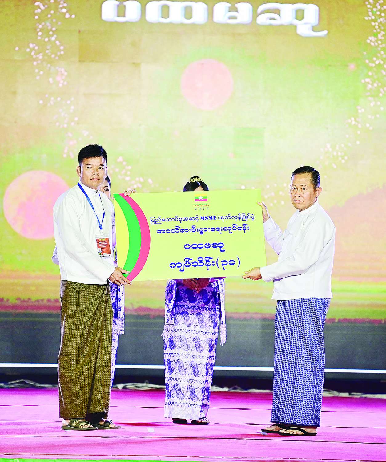 ဦးစွာ နေပြည်တော်ကောင်စီဥက္ကဋ္ဌ ဦးသန်းထွန်းဦးက အသေးစားစက်မှုလက်မှုလုပ်ငန်း (စားသောက်ကုန်၊ လူသုံးကုန်၊ ရက်ကန်းထည်၊ လက်မှုထည်) စံပြထုတ်ကုန် အထူးဆုရရှိသူ (၁၂) ဦးတို့အားလည်းကောင်း၊ သိပ္ပံနှင့်နည်းပညာဝန်ကြီးဌာန ပြည်ထောင်စုဝန်ကြီး ဒေါက်တာမျိုးသိန်းကျော်က ကုန်ထုတ်သမဝါယမအသင်း စွမ်းဆောင်ရည်အထူးဆုရရှိသူ (၅) ဦးနှင့် အသေးစား (Micro) စီးပွားရေးလုပ်ငန်းများ အထူးဆုရရှိသူ (၅) ဦးတို့အားလည်းကောင်း ဆုများပေးအပ်ချီးမြှင့်ကြသည်။