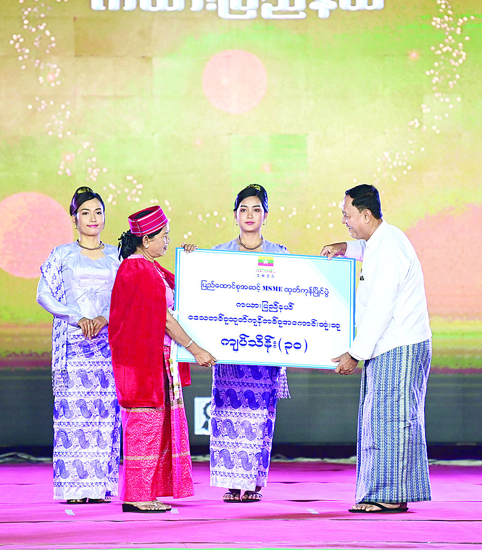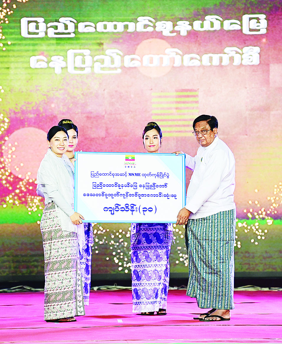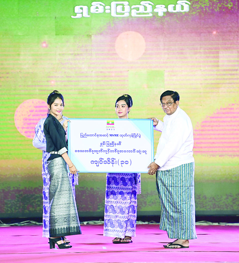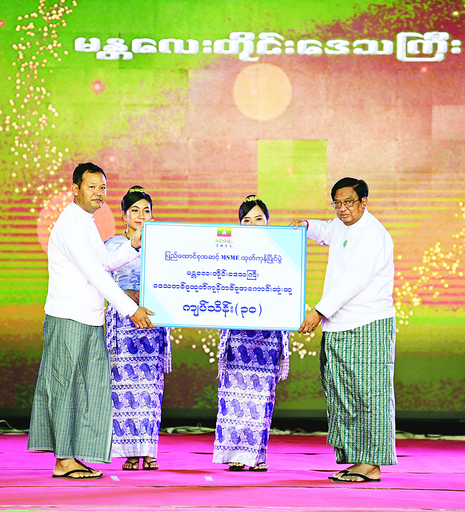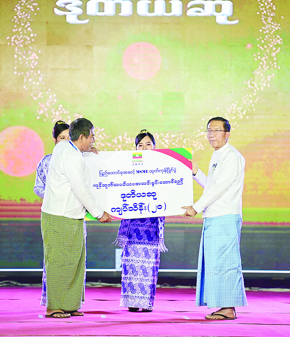ပြည်ထောင်စုအဆင့် MSME ထုတ်ကုန်ပြပွဲနှင့်ပြိုင်ပွဲ၏ ဆုချီးမြှင့်ခြင်းအခမ်းအနားကို ယနေ့ညနေပိုင်းတွင် နေပြည်တော်ရှိ ဥပ္ပါတသန္တိစေတီတော် တပေါင်းကွင်း၌ ကျင်းပပြုလုပ်ရာ အသေးစား၊ အငယ်စားနှင့်အလတ်စားစီးပွားရေးလုပ်ငန်းများ ဖွံ့ဖြိုးတိုးတက်ရေးလုပ်ငန်းကော်မတီဥက္ကဋ္ဌ နိုင်ငံတော်စီမံအုပ်ချုပ်ရေးကောင်စီ ဒုတိယဥက္ကဋ္ဌ ဒုတိယဝန်ကြီးချုပ် ဒုတိယဗိုလ်ချုပ်မှူးကြီး စိုးဝင်းတက်ရောက်၍ ဆုများပေးအပ်ချီးမြှင့်သည်။