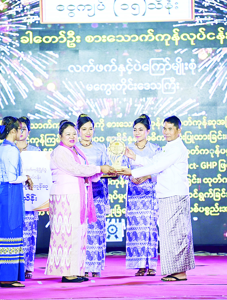 ယင်းနောက် သမဝါယမနှင့်ကျေးလက်ဖွံ့ဖြိုးရေးဝန်ကြီးဌာန ပြည်ထောင်စုဝန်ကြီး ဦးလှမိုးက ဒေသတစ်ခုထုတ်ကုန်တစ်ခု (OROP) အကောင်းဆုံးရရှိကြသည့် ကချင်ပြည်နယ်၊ ကယားပြည်နယ်၊ ကရင်ပြည်နယ်၊ ချင်းပြည်နယ်၊ စစ်ကိုင်းတိုင်းဒေသကြီး၊ တနင်္သာရီတိုင်းဒေသကြီးနှင့် ပဲခူးတိုင်းဒေသကြီးတို့မှ ပြိုင်ပွဲဝင်များအားလည်းကောင်း၊ စိုက်ပျိုးရေး၊ မွေးမြူရေးနှင့် ဆည်မြောင်းဝန်ကြီးဌာန ပြည်ထောင်စုဝန်ကြီး ဦးမင်းနောင်က အသေးစားစက်မှုလက်မှုလုပ်ငန်း (စားသောက်ကုန်၊ လူသုံးကုန်၊ ရက်ကန်းထည်၊ လက်မှုထည်) စံပြထုတ်ကုန်ဆုရရှိသူ (၄) ဦးနှင့် အသေးစား၊ အငယ်စား၊ အလတ်စား စီးပွားရေးလုပ်ငန်းများနှင့် ကုန်ထုတ်သမဝါယမအသင်းစွမ်းဆောင်ရည် တတိယဆုရရှိသူများဖြစ်ကြသည့် အသေးစား ထုတ်ကုန်လုပ်ငန်းတွင် ရန်ကုန်တိုင်းဒေသကြီး “ဝိသာခါ” အမွေးတိုင်နှင့် လူသုံးကုန်ပစ္စည်း အမျိုးမျိုးလုပ်ငန်းမှ ဒေါ်ဖြူဖြူဥ၊ အငယ်စားထုတ်ကုန်လုပ်ငန်းတွင် မန္တလေးတိုင်းဒေသကြီး “HMG” မော်တော်ယာဉ်လေစစ်ဘူးလုပ်ငန်းမှ ဦးလှိုင်မိုး၊ အလတ်စားထုတ်ကုန်လုပ်ငန်းတွင် တနင်္သာရီတိုင်းဒေသကြီး “မြန်မာအတ္တလန်တစ်” ကုမ္ပဏီလီမိတက်မှ ဦးစိုးမိုးနိုင်၊ သမဝါယမ အသင်းစွမ်းဆောင်ရည်ဆုရရှိသည့် ပြည်ထောင်စုနယ်မြေနေပြည်တော် “သားတင်ဦး” အထွေထွေစီးပွားရေးလုပ်ငန်းသမဝါယမအသင်းမှ တာဝန်ရှိသူတို့အားလည်းကောင်း ဂုဏ်ပြုဆုတံဆိပ်၊ ဂုဏ်ပြုမှတ်တမ်းလွှာနှင့် ဂုဏ်ပြုဆုငွေများ ပေးအပ်ချီးမြှင့်ကြသည်။