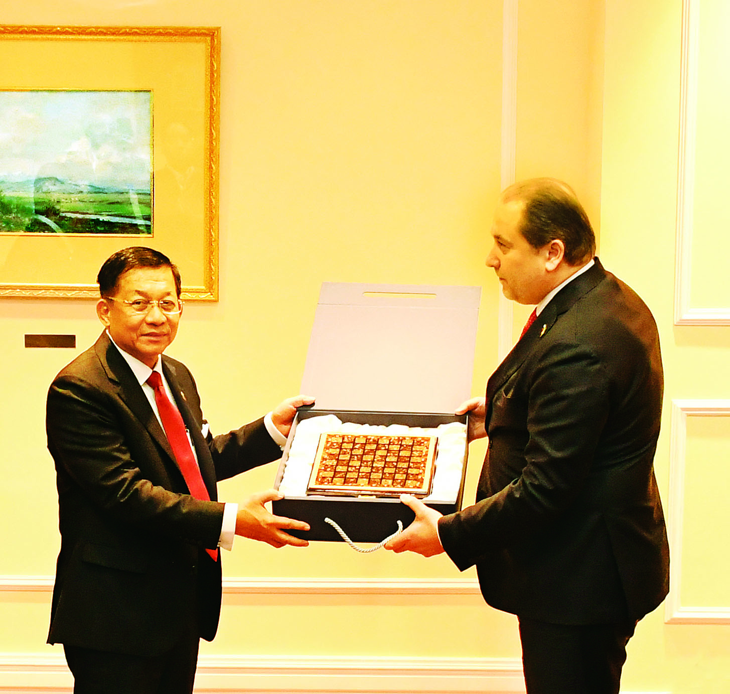ရုရှားဖက်ဒရေးရှင်းနိုင်ငံသို့ တရားဝင်ချစ်ကြည်ရေးခရီးရောက်ရှိနေသည့် နိုင်ငံတော်စီမံအုပ်ချုပ်ရေးကောင်စီဥက္ကဋ္ဌ နိုင်ငံတော်ဝန်ကြီးချုပ် ဗိုလ်ချုပ်မှူးကြီးမင်းအောင်လှိုင်သည် မတ် ၄ ရက်နေ့ညပိုင်းတွင် ရုရှား-အာဆီယံစီးပွားရေးကော်မရှင်ဥက္ကဋ္ဌ Mr. Ivan Polyakov ဦးဆောင်သည့်အဖွဲ့အား မော်စကိုမြို့၊ Radisson Collection ဟိုတယ်ရှိ အစည်းအဝေးခန်းမ၌ လက်ခံတွေ့ဆုံသည်။