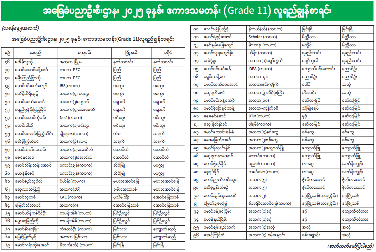 အခြေခံပညာဦးစီးဌာန၊ ၂၀၂၅ ခုနှစ်၊ ဧကာဒသမတန်း (Grade 11) လူရည်ချွန်စာရင်း