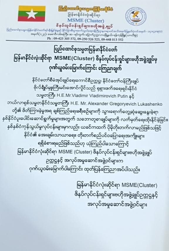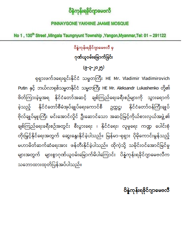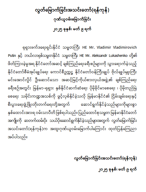 နိုင်ငံတော်စီမံအုပ်ချုပ်ရေးကောင်စီဥက္ကဋ္ဌ နိုင်ငံတော်ဝန်ကြီးချုပ် ဗိုလ်ချုပ်မှူးကြီး မင်းအောင်လှိုင်၏ ရုရှားဖက်ဒရေးရှင်းနိုင်ငံနှင့် ဘယ်လာရုစ်သမ္မတနိုင်ငံများသို့ သွားရောက်သည့် ချစ်ကြည်ရေးခရီးစဉ်များတွင် နိုင်ငံတော်အတွက် ကဏ္ဍစုံဖွံ့ဖြိုးတိုးတက်အောင် ကြိုးပမ်းဆောင်ရွက်ခဲ့မှုအပေါ် အဖွဲ့အစည်းများမှ ဂုဏ်ယူဝမ်းမြောက်ကြောင်း ထုတ်ပြန်ကြေညာ