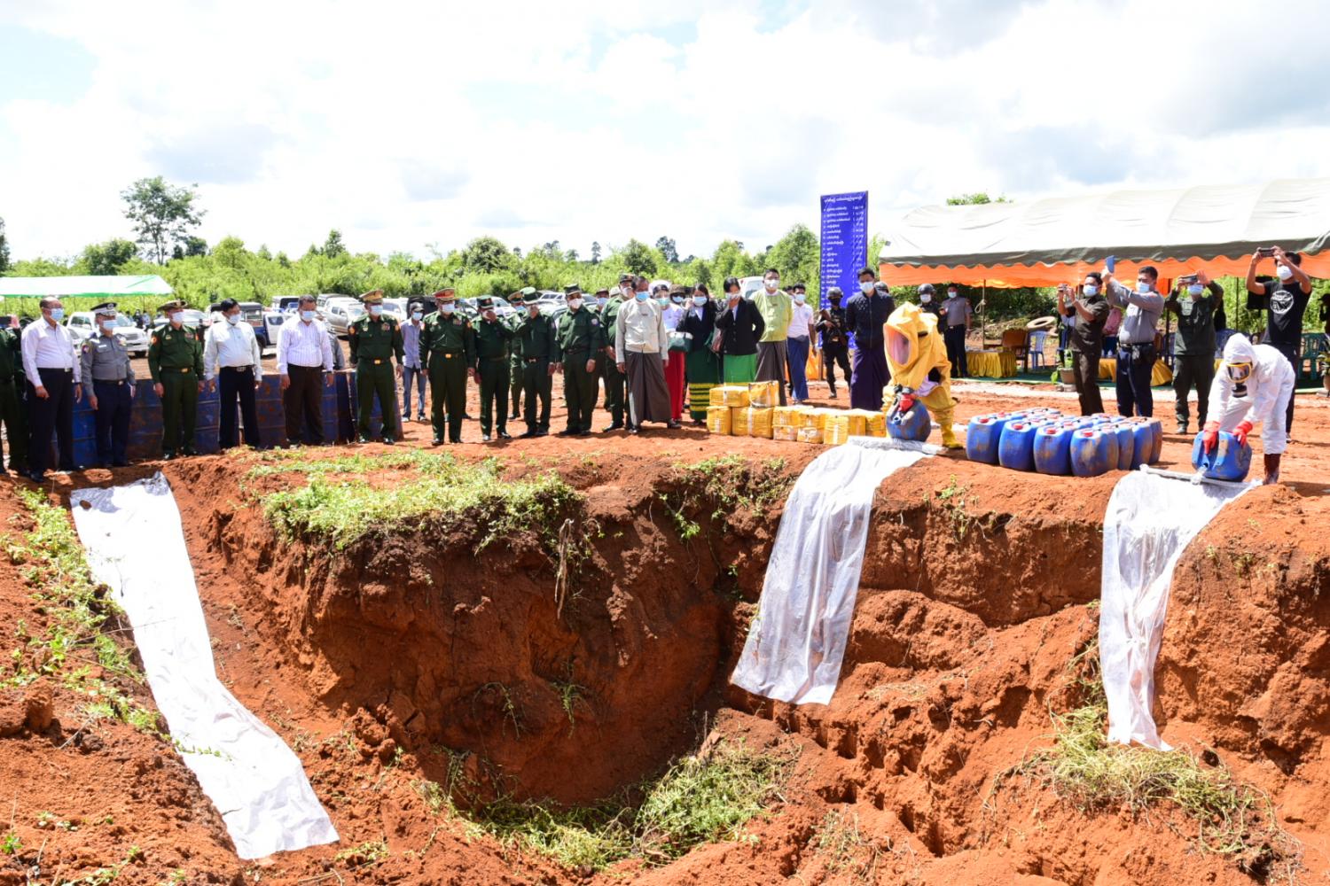 ထို့နောက် ပြည်နယ်ဝန်ကြီးချုပ် ဒေါက်တာလင်းထွဋ်၊ အရှေ့အလယ်ပိုင်းတိုင်းမှူးနှင့် တာဝန်ရှိသူများ သည် ဖမ်းဆီးရမိသော မူးယစ်ဆေးဝါး ချက်လုပ်ရာတွင် အသုံးပြုမည့် အက်စစ်ပုံးများအား လှည့်လည်ကြည့်ရှုပြီး မြေကျင်းထဲသို့ သွန်ချဖျက်ဆီးပေးကြကြောင်း သိရသည်။