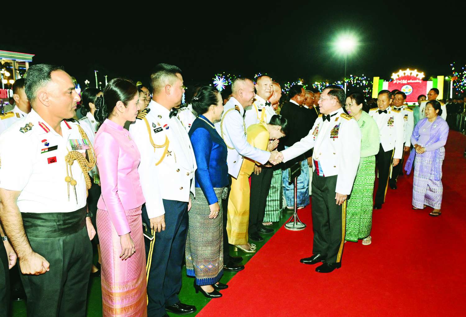 နိုင်ငံတော်စီမံအုပ်ချုပ်ရေးကောင်စီဥက္ကဋ္ဌ တပ်မတော်ကာကွယ်ရေးဦးစီးချုပ် ဗိုလ်ချုပ်မှူးကြီးမင်းအောင်လှိုင်နှင့်ဇနီး ဒေါ်ကြူကြူလှတို့က တည်ခင်းဧည့်ခံသည့် ၂၀၂၅ ခုနှစ် နှစ် (၈၀) ပြည့် တပ်မတော်နေ့အထိမ်းအမှတ် အကြိုဂုဏ်ပြုညစာစားပွဲ အခမ်းအနားကို ယနေ့ညပိုင်းတွင် နေပြည်တော်ရှိ ဇေယျာသီရိဗိမာန် ဥပစာရင်ပြင်၌ ကျင်းပပြုလုပ်သည်။