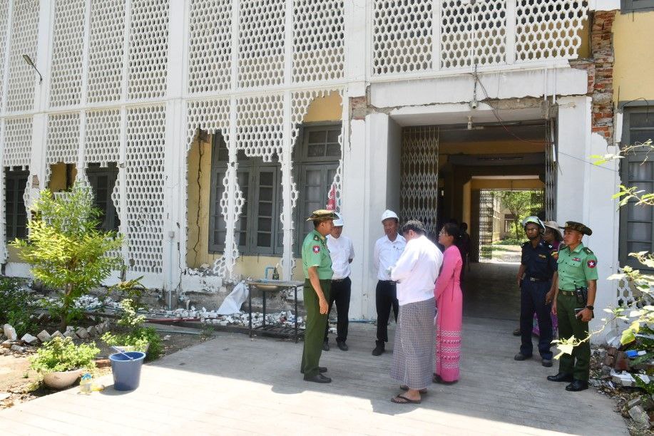 အလားတူ ကာကွယ်ရေးဦးစီးချုပ်ရုံး (ကြည်း) မှ ဒုတိယဗိုလ်ချုပ်ကြီးမျိုးမိုးအောင်သည် တာဝန်ရှိသူများနှင့်အတူ မန္တလေးတက္ကသိုလ်ရှိ ငလျင်ဒဏ်သင့်၍ထိခိုက်ပျက်စီးခဲ့သော မန်းသပြေကျောင်းဆောင်၊ ထမင်းစားဆောင်၊ ရွှေမန်းကျောင်းသူဆောင်၊ သစ္စာကျောင်းဆောင် အဆောက်အအုံများအား အသိအမှတ်ပြုလက်မှတ်ရ အင်ဂျင်နီယာ (PE) အဖွဲ့များက (SOP) အတိုင်း စစ်ဆေးနေမှုများ၊ Level-1 အဆင့်စစ်ဆေးပြီး အဆောက်အအုံများအား ပျက်စီးမှုအဆင့်အတန်းအလိုက် POST EARTHQUAKE ASSESSMENT သတ်မှတ်၍ ခွဲခြားထားသည့် အရောင်များအတိုင်း အဆင့်သတ်မှတ်မှုအခြေအနေများအား လိုက်လံကြည့်ရှု၍ ငလျင်ဒဏ်သင့်ဆရာ/ဆရာမများအတွက် ထောက်ပံ့ပစ္စည်းများပေးအပ်ပြီး တာဝန်ရှိသူများအား ငလျင်ဒဏ်ကြောင့်ပျက်စီးသွားသည့် အဆောက်အအုံများအနက် အသိအမှတ်ပြုလက်မှတ်ရ အင်ဂျင်နီယာ (PE) အဖွဲ့များက (SOP) အတိုင်း စစ်ဆေးပြီး အဆင့်သတ်မှတ်ပြီးစီးသည့် အဆောက်အအုံများအား ဦးစားပေး အဆင့်အလိုက်ဖယ်ရှားရှင်းလင်းရေးနှင့် ပြန်လည်ပြုပြင်တည်ဆောက်ရေး လုပ်ငန်းများ အမြန်ဆုံးဆောင်ရွက်နိုင်ရန် သက်ဆိုင်ရာဝန်ကြီးဌာနသို့ တင်ပြသွားရန်နှင့် အသုံးပြု၍ရသည့် ပရိဘောဂပစ္စည်းများအား စနစ်တကျ ပြန်လည်ပြုပြင်ထိန်းသိမ်းသွားရန်မှာကြားပြီး လိုအပ်သည်များ ပေါင်းစပ်ညှိနှိုင်းဆောင်ရွက်ပေးသည်။