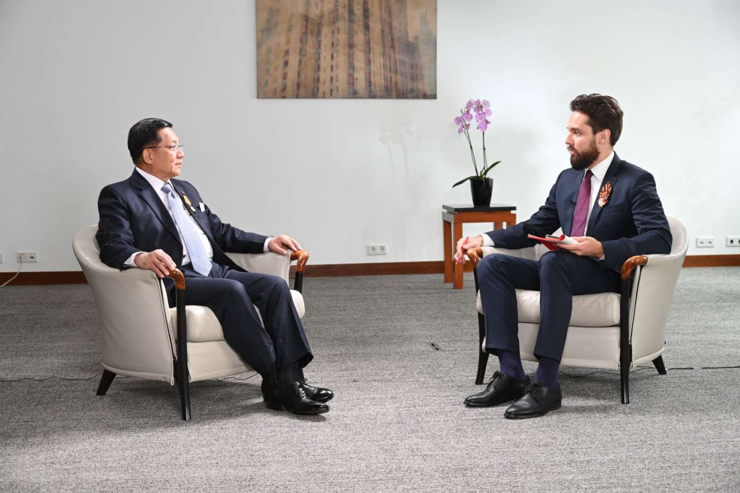 ထို့သို့ တွေ့ဆုံမေးမြန်းရာတွင် RT TV Channel မှ အယ်ဒီတာချုပ်နှင့် Krasnaya Zvezda သတင်းစာမှ အထူးသတင်းထောက်တို့၏ မြန်မာနိုင်ငံတွင် မန္တလေးငလျင်ကြီး လှုပ်ခတ်ခဲ့မှုနှင့် နိုင်ငံတကာမှ ကယ်ဆယ်ရေးနှင့်အကူအညီပေးရေးဆိုင်ရာများကို ကူညီဆောင်ရွက်ပေးခဲ့မှု၊ လူသားချင်းစာနာထောက်ထားမှု ဆက်ဆံရေးအပြင် ရုရှားဖက်ဒရေးရှင်းနိုင်ငံနှင့် မြန်မာနိုင်ငံတို့အကြား အခြားနယ်ပယ်ပေါင်းစုံ၌ ပူးပေါင်းဆောင်ရွက်လျက်ရှိမှု၊ ရုရှားဖက်ဒရေးရှင်းနိုင်ငံတွင် ကျင်းပပြုလုပ်မည့် ၁၉၄၁-၁၉၄၅ မဟာမျိုးချစ်စစ်ပွဲကြီးအောင်ပွဲ နှစ်(၈၀)ပြည့် အထိမ်းအမှတ် စစ်ရေးပြအခမ်းအနားဆိုင်ရာ သမိုင်းကြောင်းအပေါ် ထင်မြင်ချက်များ၊ မြန်မာ့တပ်မတော်ကိုယ်စားပြု စစ်ရေးပြတပ်ဖွဲ့တစ်ဖွဲ့အနေဖြင့် ပထမဆုံးအကြိမ်အဖြစ် ယခုစစ်ရေးပြအခမ်းအနားတွင် ပါဝင်ချီတက်မည့်အပေါ် သဘောထားအမြင်၊ အာဆီယံဒေသအတွင်း မြန်မာနိုင်ငံ၏အခန်းကဏ္ဍ စသည်တို့နှင့် အခြားသိရှိလိုသည်များအား မေးမြန်းရာ နိုင်ငံတော်စီမံအုပ်ချုပ်ရေးကောင်စီဥက္ကဋ္ဌ နိုင်ငံတော်ဝန်ကြီးချုပ်က ပြည့်ပြည့်စုံစုံ ရှင်းလင်းပြောကြားခဲ့ကြောင်းနှင့် မေးမြန်းဖြေကြားမှုအပြည့်အစုံအား ဆက်လက်ဖော်ပြသွားမည်ဖြစ်သည်။