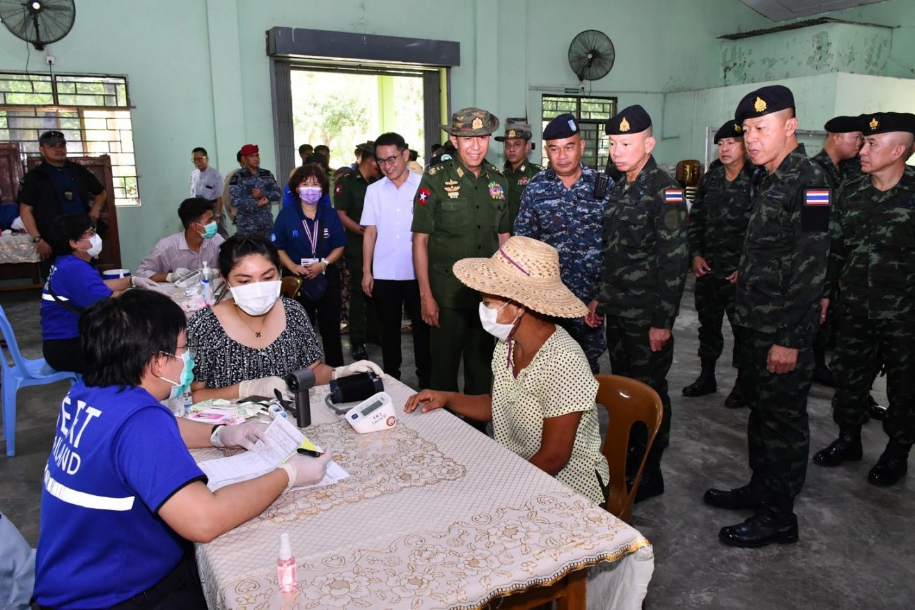 ဦးစွာ ထိုင်းဘုရင့်တပ်မတော် ဒုတိယတပ်မတော်ကာကွယ်ရေးဦးစီးချုပ် General UKRIS BOONTANONDHA ၊ ဒုတိယဗိုလ်ချုပ်ကြီး မျိုးမိုးအောင်နှင့် အဖွဲ့သည် အမှတ်(၂၇) အခြေခံပညာအထက်တန်းကျောင်း အောင်တံခွန်ခန်းမ၌ ထိုင်းနိုင်ငံပြည်သူ့ကျန်းမာရေးဝန်ကြီးဌာနမှ ဒေါက်တာနရုမော်ဦးစီး၍ ငလျင်ဘေးသင့်ပြည်သူများအား ကျန်းမာရေးစောင့်ရှောက်မှုလုပ်ငန်းများ ဆောင်ရွက်နေမှုအခြေအနေများအား သွားရောက်ကြည့်ရှုအားပေးပြီး လိုအပ်သည်များ ပေါင်းစပ်ညှိနှိုင်းဆောင်ရွက်ပေးသည်။
