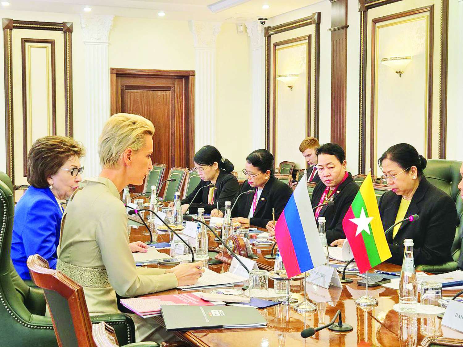 နိုင်ငံတော်စီမံအုပ်ချုပ်ရေးကောင်စီဥက္ကဋ္ဌ နိုင်ငံတော်ဝန်ကြီးချုပ် ဗိုလ်ချုပ်မှူးကြီး မင်းအောင်လှိုင်နှင့်အတူ ရုရှားဖက်ဒရေးရှင်းနိုင်ငံသို့ ရောက်ရှိနေသည့် ဇနီး ဒေါ်ကြူကြူလှသည် ယနေ့ဒေသစံတော်ချိန် နံနက်ပိုင်းတွင် BRICS အမျိုးသမီးစီးပွားရေး မဟာမိတ်အဖွဲ့ရုရှားဖက်ဒရေးရှင်းနိုင်ငံဆိုင်ရာဥက္ကဋ္ဌ Ms. Anna Nesterova နှင့် ရုရှားဖက်ဒရေးရှင်းနိုင်ငံ ဖက်ဒရယ်ကောင်စီရုံး၌ တွေ့ဆုံဆွေးနွေးသည်။
