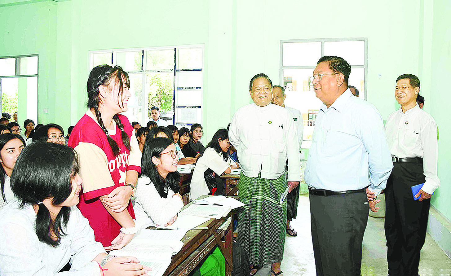 ထိုသို့တွေ့ဆုံစဉ် ပြည်ထောင်စုဝန်ကြီးက တက္ကသိုလ်ဝင်တန်းအဆင့်သည် အခြေခံပညာအဆင့်တွင် အဆင့်အမြင့်ဆုံးဖြစ်ပြီး နိုင်ငံတကာ “စံ အရ တက္ကသိုလ်ဝင်ခွင့် အသိအမှတ်ပြု စာမေးပွဲဖြစ်သည့်အတွက် အလွန်အရေးကြီးပါကြောင်း၊ ငလျင်ဒဏ်မှရုန်းထွက်၍ မိမိရည်မှန်းချက်အတိုင်း ယခုကဲ့သို့ မလျှော့သော ဇွဲလုံ့လဖြင့် တစိုက်မတ်မတ် ကြိုးစားဆောင်ရွက်မှုများသည် ဘဝတစ်လျှောက်ကြုံတွေ့နိုင်မည့် အခက်အခဲများကို အောင်မြင်စွာကျော်လွှားနိုင်ရန် အဓိကကျသည့် စိတ်ခွန်အားတစ်ခုပင်ဖြစ်ပါကြောင်း၊ ယခု Grade-12 စာမေးပွဲအား အဆင်ပြေချောမွေ့စွာဖြေဆိုနိုင်ရန် ကျောင်းသား၊ ဆရာ၊ မိဘများ တက်ညီလက်ညီ ဆောင်ရွက်နေသကဲ့သို့ နိုင်ငံတော်အကြီးအကဲ၏ လမ်းညွှန်ချက်အရ အစိုးရအဖွဲ့အစည်း အသီးသီးမှလည်း အထူးအလေးထား ကြပ်မတ်ကူညီဆောင်ရွက်ပေးလျက်ရှိပါကြောင်း၊ ပြင်ဦးလွင်ခရိုင်တွင် စာမေးပွဲဖြေဆိုမည့် ကျောင်းသား ကျောင်းသူ အင်အား၏ ၉၉ ရာခိုင်နှုန်း တက်ရောက်ပညာသင်ကြားလျက်ရှိသည်ကို တွေ့ရှိသဖြင့် အလွန်အားရကျေနပ်မိပါကြောင်း၊ ကျန်ရှိနေသော အခက်အခဲရှိသည့် ကျောင်းသား ကျောင်းသူများကိုလည်း အမြန်ဆုံးရောက်ရှိပညာသင်ကြားနိုင်ရေး ကူညီဆောင်ရွက်ပေးသွားရန် လိုအပ်မည်ဖြစ်ပါကြောင်း၊ ယခုလို အားသွန်ခွန်စိုက် လာရောက်သင်ကြားပို့ချပေးသည့် ဆရာ ဆရာမများကိုလည်း ကျေးဇူးတင်အသိအမှတ်ပြုပါကြောင်း အားပေးစကားပြောကြားကာ စားသောက်ဖွယ်ရာများနှင့် ထောက်ပံ့ပစ္စည်းများပေးအပ်သည်။