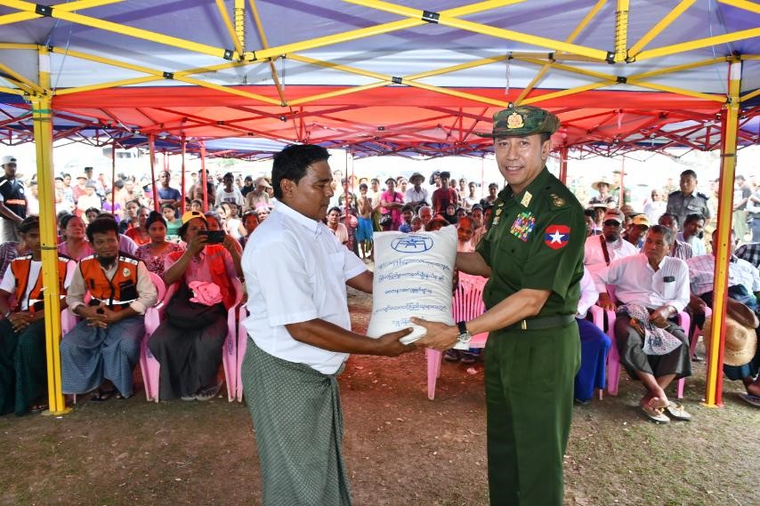 အလားတူ ကာကွယ်ရေးဦးစီးချုပ်ရုံး(ကြည်း)မှ ဒုတိယဗိုလ်ချုပ်ကြီး မျိုးမိုးအောင်နှင့် တာဝန်ရှိသူများသည် မန္တလေးတိုင်းဒေသကြီး၊ အမရပူရမြို့နယ်၊ ဘုံးအိုးကျေးရွာတွင် ဖွင့်လှစ်ထားသော ငလျင်ဘေးသင့်ပြည်သူများ ယာယီကယ်ဆယ်ရေးစခန်းသို့သွားရောက်၍ ဘုံးအိုးကျေးရွာအုပ်စုအတွင်းရှိ ငလျင်ဘေးသင့်ပြည်သူများအား ထောက်ပံ့ပစ္စည်းများပေးအပ်ခြင်း အခမ်းအနားသို့တက်ရောက်ကာ ငလျင်ဘေးသင့်ပြည်သူ အိမ်ထောင်စု (၇၀၀) စာအတွက် ဆန်၊ ဆီ၊ ကုလားပဲစသည့် ထောက်ပံ့ပစ္စည်းများအား ပေးအပ်လှူဒါန်းရာ ငလျင်ဒဏ်သင့်ပြည်သူများကိုယ်စားကျေးရွာမှ တာဝန်ရှိသူတစ်ဦးက လက်ခံရယူသည်။