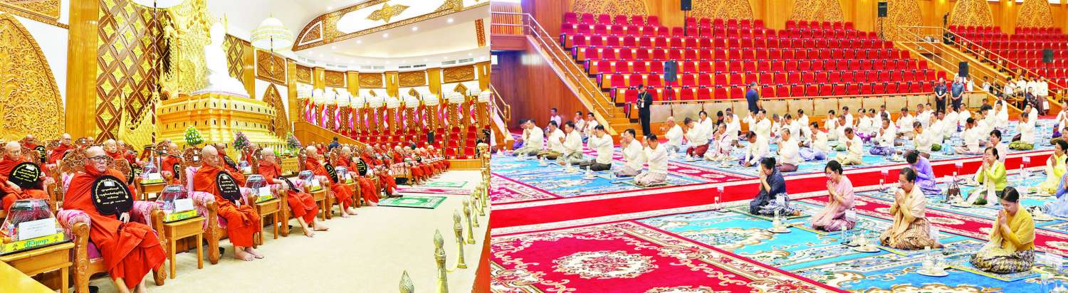 ထို့နောက် အခမ်းအနားကို နမောတဿ သုံးကြိမ်ရွတ်ဆို ဘုရားကန်တော့ဖွင့်လှစ်၍ နိုင်ငံတော် စီမံအုပ်ချုပ်ရေးကောင်စီ ဒုတိယဥက္ကဋ္ဌ ဒုတိယဝန်ကြီးချုပ်နှင့်ဇနီး အမှူးပြုသော ဧည့်ပရိသတ်များက နိုင်ငံတော်သံဃမဟာ နာယကအဖွဲ့ဥက္ကဋ္ဌ ဒေါက်တာ ဘဒ္ဒန္တစန္ဒိမာဘိဝံသထံမှ ကိုးပါးသီလ ခံယူဆောက်တည်ကြပြီး သံဃာတော်အရှင်သူမြတ်များ ရွတ်ပွားသရဇ္ဈာယ်တော်မူသော မေတ္တသုတ် ပရိတ်တရားတော်များကို နာယူကြည်ညိုကြသည်။