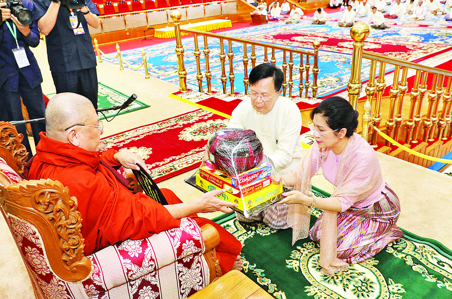 အခမ်းအနားသို့ အထူးပင့်ဖိတ်ထားသည့် နိုင်ငံတော် သံဃမဟာနာယကအဖွဲ့ဥက္ကဋ္ဌ ရန်ကုန်တိုင်းဒေသကြီး သန်လျင်မြို့မင်းကျောင်းပထမပြန် စာသင်တိုက်ပဓာနနာယက၊ အဂ္ဂမဟာပဏ္ဍိတ အဂ္ဂမဟာသဒ္ဓမ္မဇောတိကဓဇ ဒေါက်တာဘဒ္ဒန္တစန္ဒိမာဘိဝံသနှင့် နိုင်ငံတော်သံဃမဟာနာယကအဖွဲ့ အကျိုးတော်ဆောင်၊ မန္တလေးတိုင်းဒေသကြီးမဟာ အောင်မြေမြို့နယ် မစိုးရိမ်တိုက်သစ် မဟာနာယက ဓမ္မသမိဒ္ဓိ ကျောင်းဆရာတော် အဂ္ဂမဟာပဏ္ဍိတ အဂ္ဂမဟာ သဒ္ဓမ္မဇောတိကဓဇ မဟာဓမ္မ ကထိကဗဟုဇနဟိတဓရ ဘဒ္ဒန္တဝါသေဋ္ဌာဘိဝံသတို့ အမှူးပြုသည့် ဆရာတော်ကြီးများ ကြွရောက်ချီးမြှင့်တော်မူကြပြီး နိုင်ငံတော် စီမံအုပ်ချုပ်ရေးကောင်စီ ဒုတိယဥက္ကဋ္ဌ ဒုတိယဝန်ကြီးချုပ်နှင့် ဇနီးတို့နှင့်အတူ ကောင်စီအတွင်းရေးမှူးနှင့် ဇနီး၊ ကောင်စီဝင်များနှင့် ဇနီးများ၊ ပြည်ထောင်စုအဆင့်ပုဂ္ဂိုလ်များ၊ ပြည်ထောင်စုဝန်ကြီးများနှင့် ဇနီးများ၊ နေပြည်တော်ကောင်စီဥက္ကဋ္ဌ၊ ကာကွယ်ရေးဦးစီးချုပ်ရုံးမှ အဆင့်မြင့်တပ်မတော် အရာရှိကြီးများနှင့်ဇနီးများ၊ နေပြည်တော် တိုင်းစစ်ဌာနချုပ်တိုင်းမှူးနှင့် တာဝန်ရှိသူများ တက်ရောက်ကြည်ညိုကြသည်။