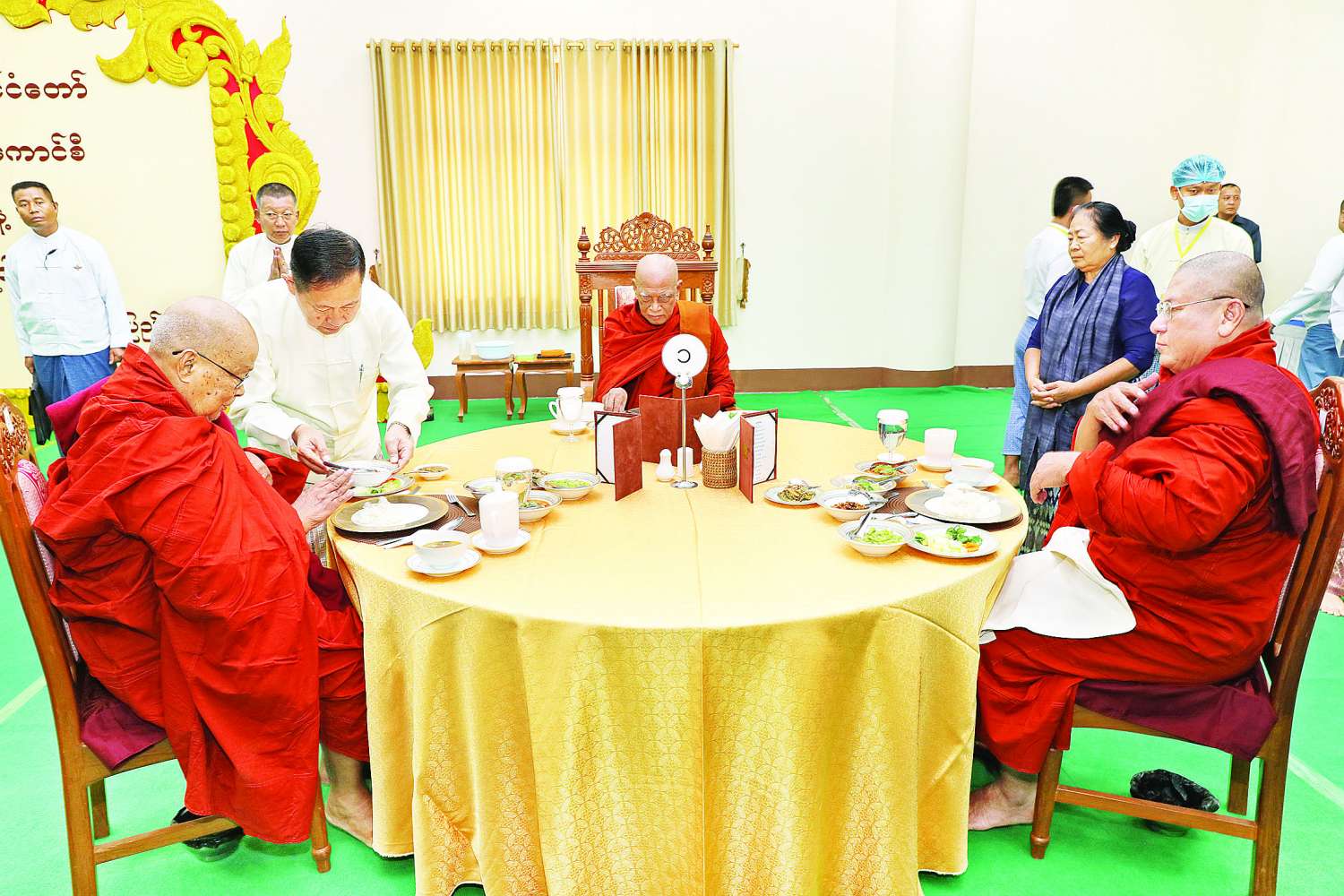 အခမ်းအနားအပြီးတွင် နိုင်ငံတော်စီမံအုပ်ချုပ်ရေးကောင်စီဒုတိယဥက္ကဋ္ဌ ဒုတိယဝန်ကြီးချုပ် ဒုတိယဗိုလ်ချုပ်မှူးကြီး စိုးဝင်းနှင့် ဇနီး၊ အခမ်းအနားတက်ရောက်လာကြသူများသည် နိုင်ငံတော်သံဃမဟာနာယကအဖွဲ့ဥက္ကဋ္ဌ သန်လျင်မင်းကျောင်း ဆရာတော်ကြီး အမှူးပြုသည့် ဆရာတော်၊ သံဃာတော်အရှင်သူမြတ်တို့အား နေ့ဆွမ်းဆက်ကပ်လှူဒါန်းခဲ့ကြောင်း သတင်းရရှိသည်။