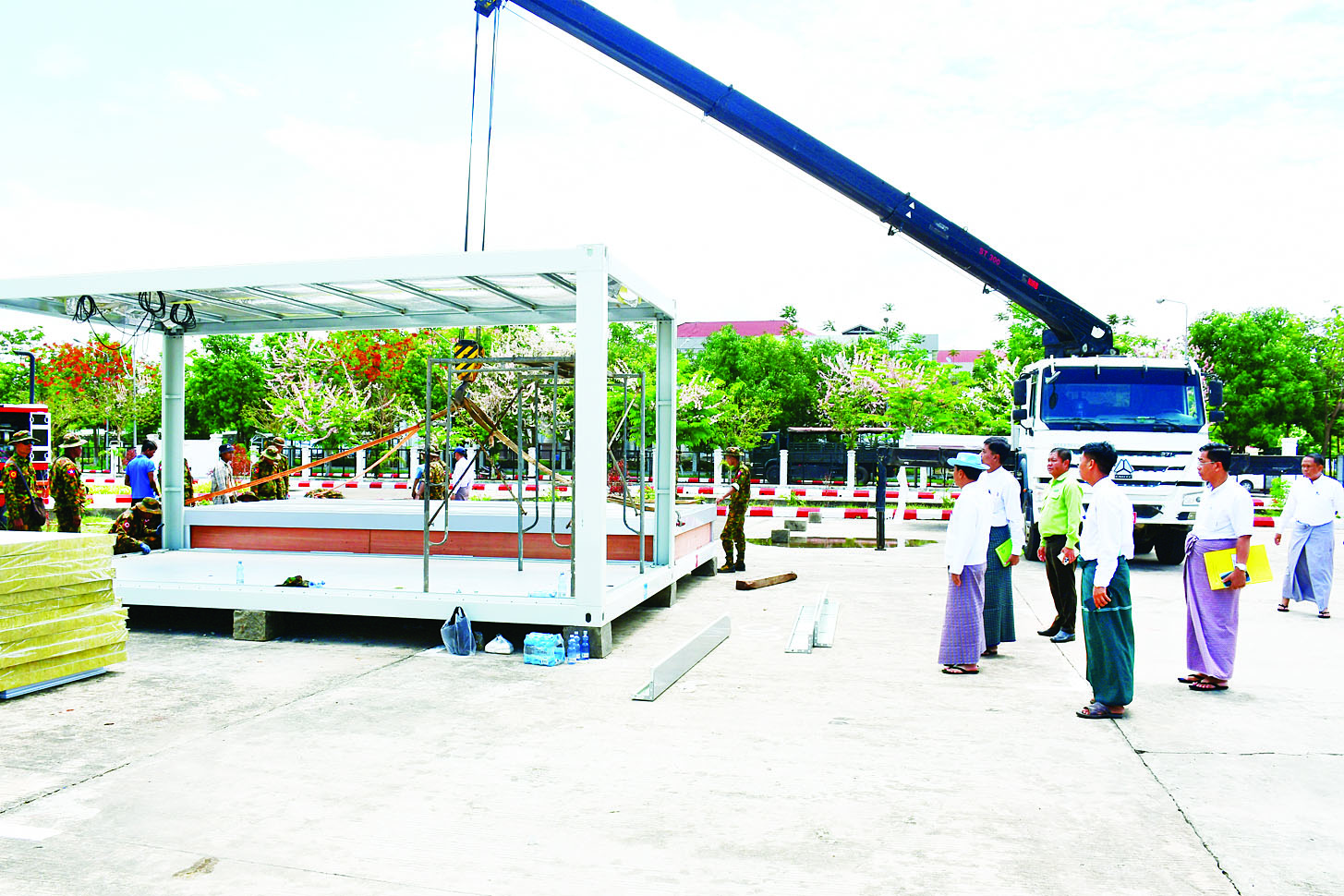 ဆက်လက်၍ နေပြည်တော်ကောင်စီဥက္ကဋ္ဌသည် နေပြည်တော်ကောင်စီ ဇမ္ဗူသီရိခန်းမဝင်း အတွင်း Prefabricated Office များ တပ်ဆင်တည်ဆောက်နေမှုနှင့် ယာယီရုံးများ ဆောက်လုပ်ထားရှိပြီး ရုံးလုပ်ငန်းများဆောင်ရွက်နေမှု အခြေအနေများကို လှည့်လည်ကြည့်ရှုစစ်ဆေးပြီး ရုံးလုပ်ငန်းများ စနစ်တကျဆောင်ရွက်ရေး၊ ရုံးခန်းများတွင် စနစ်တကျနေရာချထားရေး၊ ရုံးသုံးစက်ပစ္စည်းများအား စနစ်တကျထားရှိရေး၊ လျှပ်စစ်မီးကြိုးများ အန္တရာယ်မဖြစ်စေရန် စနစ်တကျသွယ်တန်းထားရှိရေး၊ ဝန်ထမ်းများ သက်သာချောင်ချိရေးကိစ္စရပ်များ ဆောင်ရွက်ပေးရန်တို့ကို မှာကြားသည်။