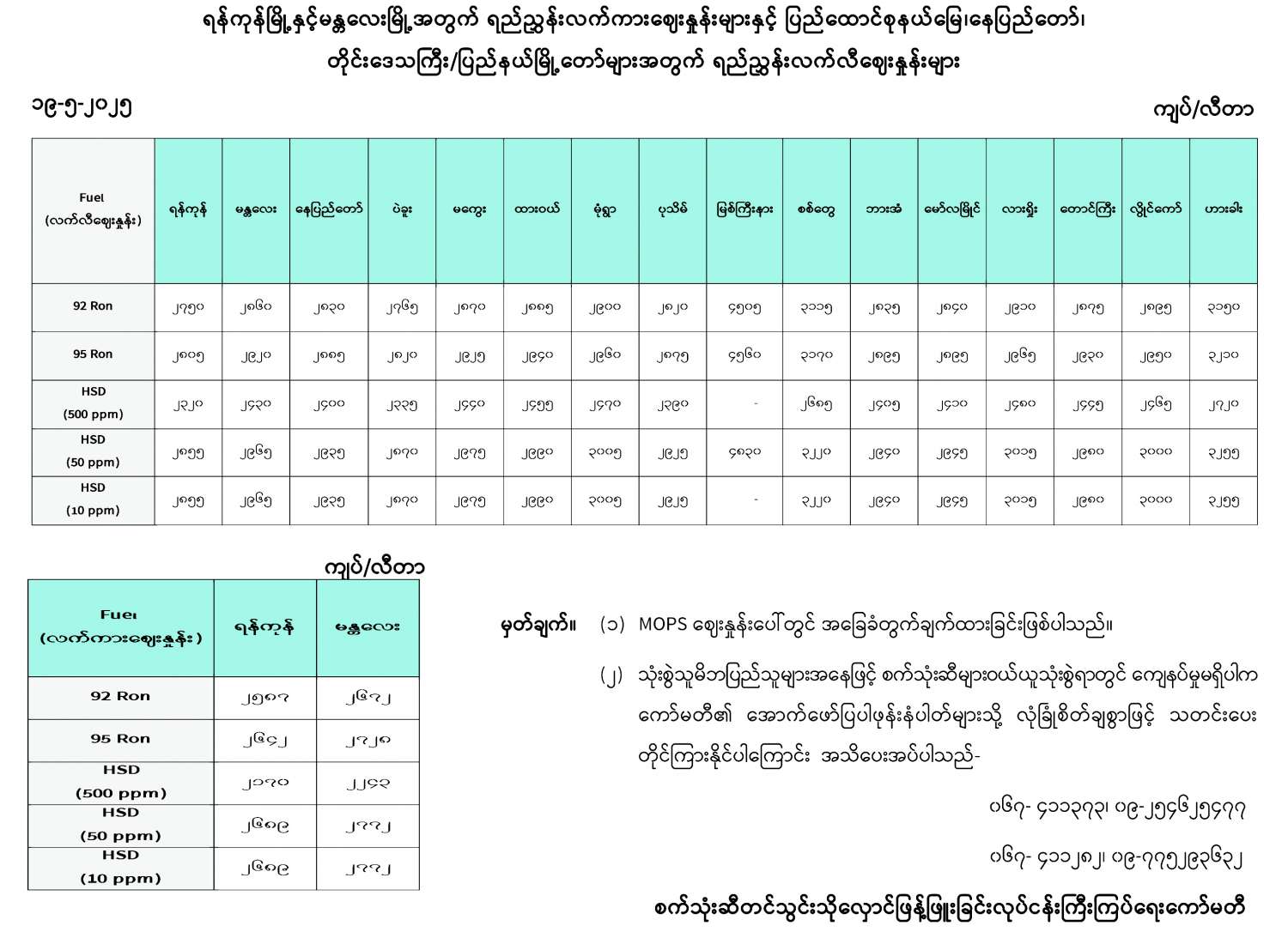 ရန်ကုန်မြို့နှင့် မန္တလေးမြို့အတွက် ရည်ညွှန်းလက်ကားဈေးနှုန်းများနှင့် ပြည်ထောင်စုနယ်မြေ နေပြည်တော်၊ တိုင်းဒေသကြီး/ပြည်နယ် မြို့တော်များအတွက် ရည်ညွှန်းလက်လီဈေးနှုန်းများ 05/19/2025