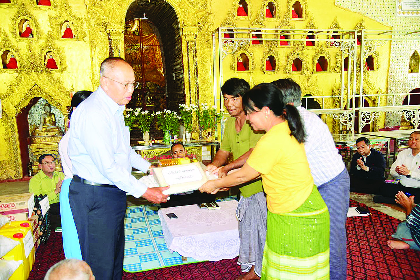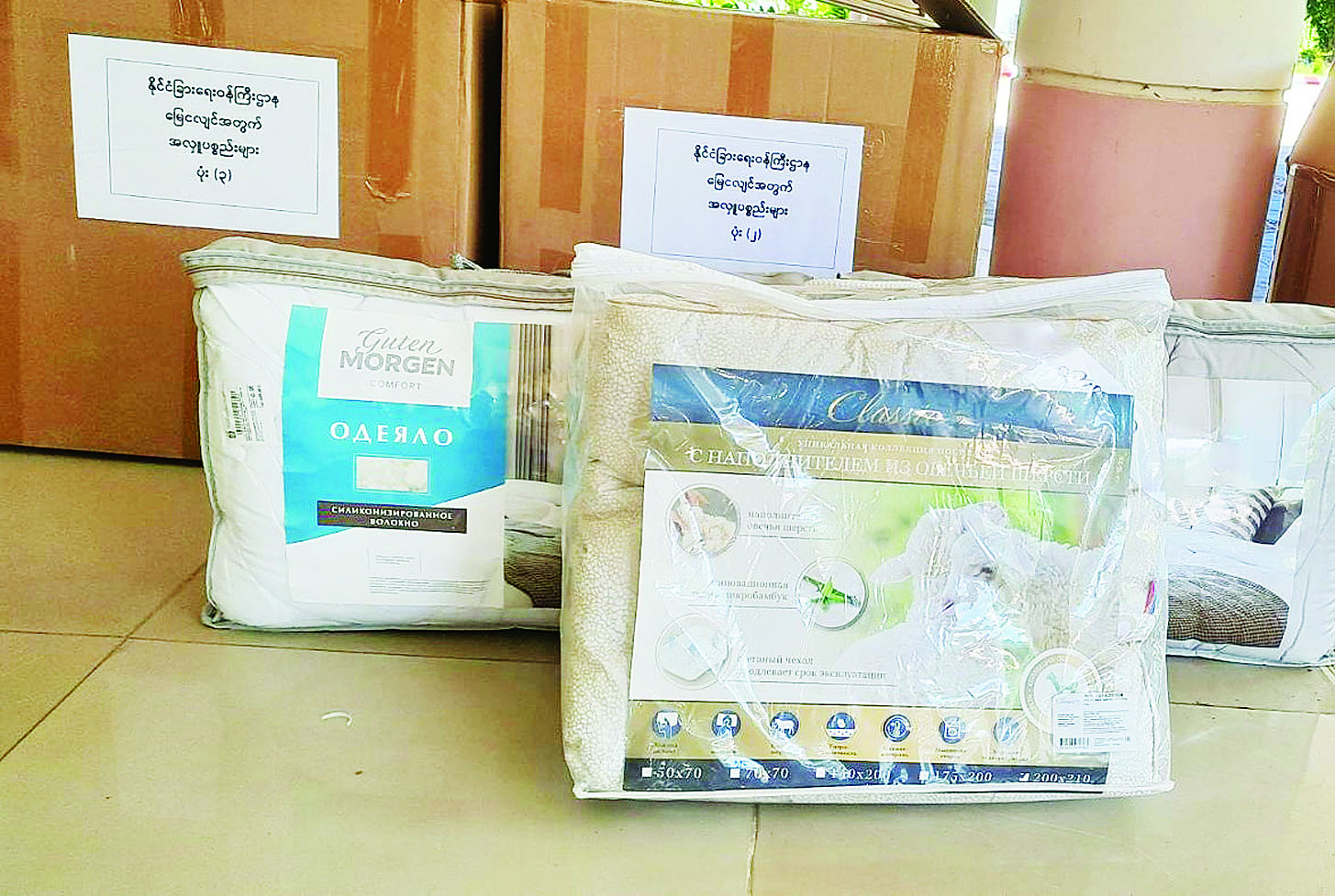 ယခုအခါ မေလ ၁၃ ရက်နေ့မှ ၁၉ ရက်နေ့အထိ ရက်သတ္တပတ် ၁ ပတ်အတွင်း အိန္ဒိယနိုင်ငံ၊ မလေးရှားနိုင်ငံ၊ ရုရှားဖက်ဒရေးရှင်းနိုင်ငံနှင့် Singapore Lotus Charity Society တို့မှ ထပ်မံ ပေးပို့လှူဒါန်းလာသော စားသောက်ကုန်ပစ္စည်း၊ လူသုံးကုန်ပစ္စည်း၊ အိမ်သုံးပစ္စည်း၊ ဆေးနှင့် ဆေးပစ္စည်းများအနက် ဆေးနှင့် ဆေးပစ္စည်းများကို ကျန်းမာရေးစောင့်ရှောက်မှု လုပ်ငန်းကော်မတီ (ကျန်းမာရေးဝန်ကြီးဌာန) သို့လည်းကောင်း၊ စားသောက်ကုန်ပစ္စည်း၊ လူသုံးကုန်ပစ္စည်း၊ အိမ်သုံးပစ္စည်းများကို နေပြည်တော်အတွင်းရှိ လိုအပ်သည့် ဝန်ကြီးဌာနများသို့လည်းကောင်း လွှဲပြောင်းထောက်ပံ့ပေးခဲ့ပါသည်။