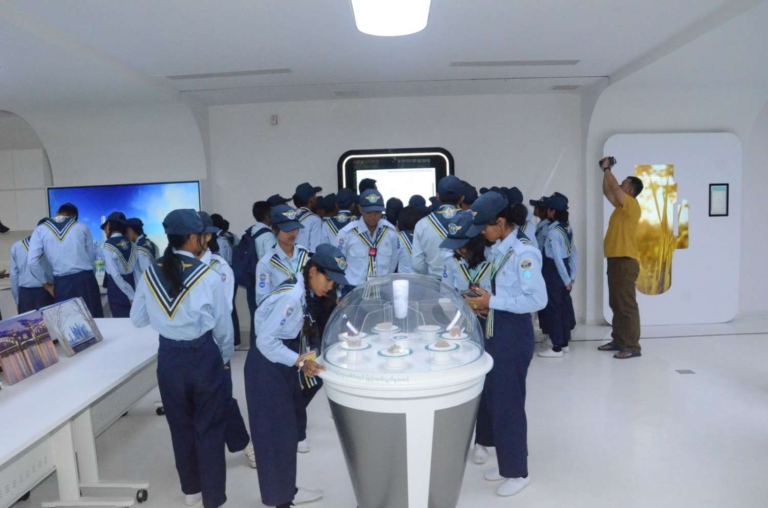 အဆိုပါ သင်တန်းသား၊ နည်းပြအုပ်ချုပ်သူများသည် ယနေ့တွင် ရန်ကုန်တိုင်းဒေသကြီး၊ လှိုင်မြို့နယ်ရှိ နျူကလီးယားနည်းပညာ သတင်းအချက်အလက်စင်တာသို့ သွားရောက်လေ့လာကြရာ တာဝန်ရှိသူများက ကြိုဆိုနှုတ်ခွန်းဆက်စကားပြောကြားသည်။ ထို့နောက် လေကြောင်းလူငယ်သင်တန်းသားများအား ပြခန်းခန်းမဆောင်တွင် ပြသထားသော နျူကလီးယားနည်းပညာအသုံးပြု၍ ရောဂါရှာဖွေမှု(ကိုမိုဂရမ်)နမူနာပုံစံ၊ အသေးစားလျှပ်စစ်ဓာတ်အားထုတ် ဓာတ်ပေါင်းဖိုအမျိုးအစားတစ်ခုဖြစ်သော RITM-200 ၏ အတွင်းပိုင်းပါဝင်ပစ္စည်းများနှင့် အလုပ်လုပ်ပုံပြနမူနာပုံစံ၊ ခန္ဓာကိုယ်၏ ဓာတ်ရောင်ခြည်ပမာဏကိုတိုင်းတာပြီး သဘာဝပတ်ဝန်းကျင်ရှိ အရာဝတ္ထုပစ္စည်းများတွင် ပါရှိသည့် ဓာတ်ရောင်ခြည်ပမာဏနှင့် နှိုင်းယှဉ်ဖော်ပြပေးသည့် Radiometer စက်၊ နျူကလီးယားနည်းပညာဆိုင်ရာ အခြေခံအကြောင်းအရာများကို မေးခွန်းများမေး၍ ဖြေကြားနိုင်သည့် ပဟေဠိဂိမ်းစနစ်၊ သဲ၊ ကျောက်၊ ဘိလပ်မြေ စသည့် သဘာဝပတ်ဝန်းကျင်ရှိ အရာဝတ္ထုများတွင် ထွက်ရှိလျက်ရှိသော ရေဒီယိုသတ္တိကြွမှုကို တိုင်းတာဖော်ပြပေးသည့် စက်၊ နျူကလီးယားဓာတ်ပေါင်းဖိုတစ်ခု၏ အတွင်းပိုင်းတွင် ပါဝင်သည့်ပစ္စည်းများနှင့် အဆင့်ဆင့်တည်ဆောက်ပုံကို 3D Virtual နည်းပညာဖြင့် ပုံဖော်ပြသသည့်ပုံစံငယ်နှင့် လေအားအသုံးပြု၍ လျှပ်စစ်ဓာတ်အားထုတ်လုပ်သည့် Wind Turbine နမူနာပုံစံငယ်တို့ကို တာဝန်ရှိသူများက အသေးစိတ်ရှင်းလင်းပြောကြားသည်။