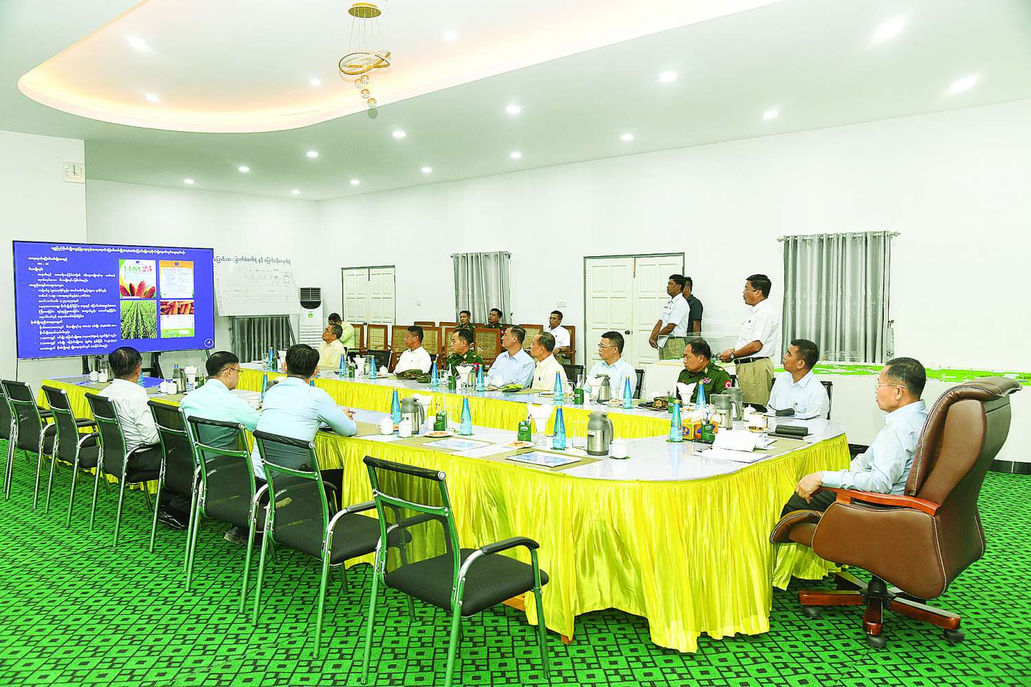 ဆက်လက်၍ နိုင်ငံတော်စီမံအုပ်ချုပ်ရေးကောင်စီဒုတိယဥက္ကဋ္ဌ ဒုတိယဝန်ကြီးချုပ် ဒုတိယဗိုလ်ချုပ်မှူးကြီးစိုးဝင်းနှင့် အဖွဲ့ဝင်များသည် မြန်မာ့စီးပွားရေးကော်ပိုရေးရှင်းမှ ဆောင်ရွက်လျက်ရှိသည့် ရွှေပြည်စိုက်ပျိုးမွေးမြူရေးဇုန် စီမံကိန်းသို့ ရောက်ရှိကြရာ အဆိုပါဇုန်အတွင်းရှိ အစည်းအဝေးခန်းမ၌ တာဝန်ရှိသူတစ်ဦးက ရွှေပြည်စိုက်ပျိုး မွေးမြူရေးဇုန်အတွင်း အကောင်အထည်ဖော် ဆောင်ရွက်လျက်ရှိသည့် ဥစားကြက်မွေးမြူရေး၊ အသားတိုးဝက်မွေးမြူရေး၊ အသားတိုးဝက်ပေါက် ထုတ်လုပ်ရေး၊ အစေ့ထုတ်ပြောင်းစပ်မျိုး (Hybrid) မျိုးစေ့စိုက်ပျိုးထုတ်လုပ်ရေး၊ တိရစ္ဆာန်အစာ ထုတ်လုပ်ရေးလုပ်ငန်း ဆောင်ရွက်နေမှုအခြေအနေများ၊ ဥစားကြက်ခြံများအတွက် ဆိုလာစနစ်ဖြင့် လျှပ်စစ်ဓာတ်အားပေးနိုင်ရေးဆောင်ရွက်နေမှု အခြေအနေများနှင့် အဆောက်အအုံများ တည်ဆောက်ထားရှိမှုအခြေအနေများကို ရှင်းလင်းတင်ပြသည်။