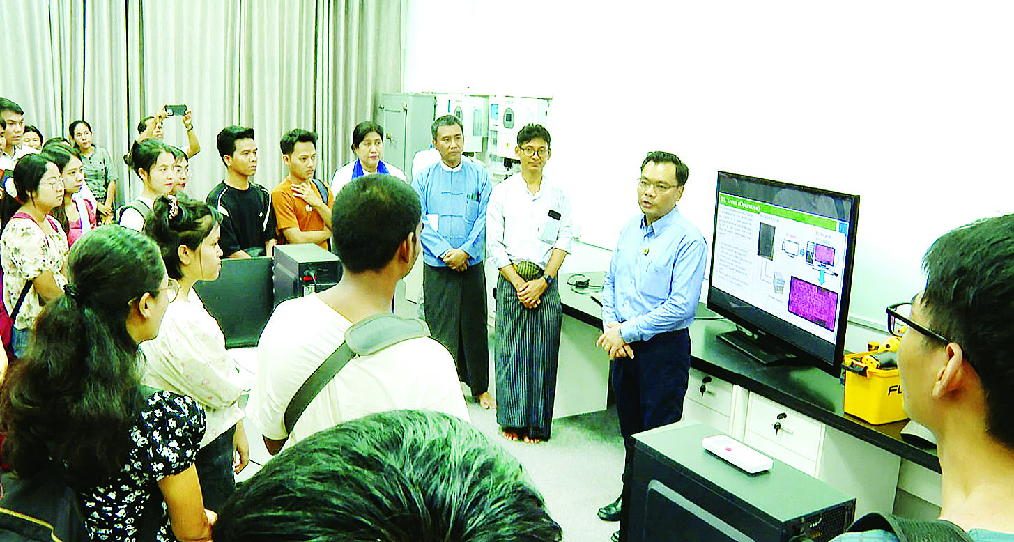 ထို့နောက် နေရောင်ခြည်အလင်းစွမ်းအင်သုံး လျှပ်စစ်ဓာတ်အား ထုတ်လုပ်ခြင်းဆိုင်ရာ သုတေသနဓာတ်ခွဲခန်း၊ Myan-mar-Japan Technological Development Center-1 နှင့် Myanmar - Japan Technolo-gical Development Center-2 သို့ရောက်ရှိပြီး Polytechnic University (မအူပင်)၊ ရန်ကုန်အနောက်ပိုင်း နည်းပညာတက္ကသိုလ်၊ ပြည်နည်းပညာ တက္ကသိုလ်နှင့် နည်းပညာတက္ကသိုလ်(တောင်ငူ)တို့မှ Internship ဆင်းနေကြသော ကျောင်းသား၊ ကျောင်းသူများနှင့်တွေ့ဆုံ၍ နေရောင်ခြည်စွမ်းအင် သုံးလျှပ်စစ်ဓာတ်အား ထုတ်လုပ်ခြင်းမှာ အရေးကြီးကြောင်း၊ ဤ ဓာတ်ခွဲခန်းတွင် Solar ပြားများ၏ အရည်အသွေးနှင့် စွမ်းဆောင်ရည် များကို တိုင်းတာနိုင်ရန်အတွက် တည်ထောင်ထားခြင်းဖြစ်ပြီး သေချာစွာလေ့လာကြရန် လိုအပ် ကြောင်း၊ အနာဂတ်စွမ်းအင်ကဏ္ဍတွင် ပြန်လည်ပြည့်ဖြိုးမြဲစွမ်းအင် ကဏ္ဍသည် အရေးကြီးသည့် အခန်းကဏ္ဍမှ ပါဝင်လာမည်ဖြစ်သောကြောင့် ကြိုးစားဆောင်ရွက်သွားကြရန်မှာကြားပြီး လက်တွေ့ဆောင်ရွက်နေမှုများကို ကြည့်ရှုအားပေးသည်။