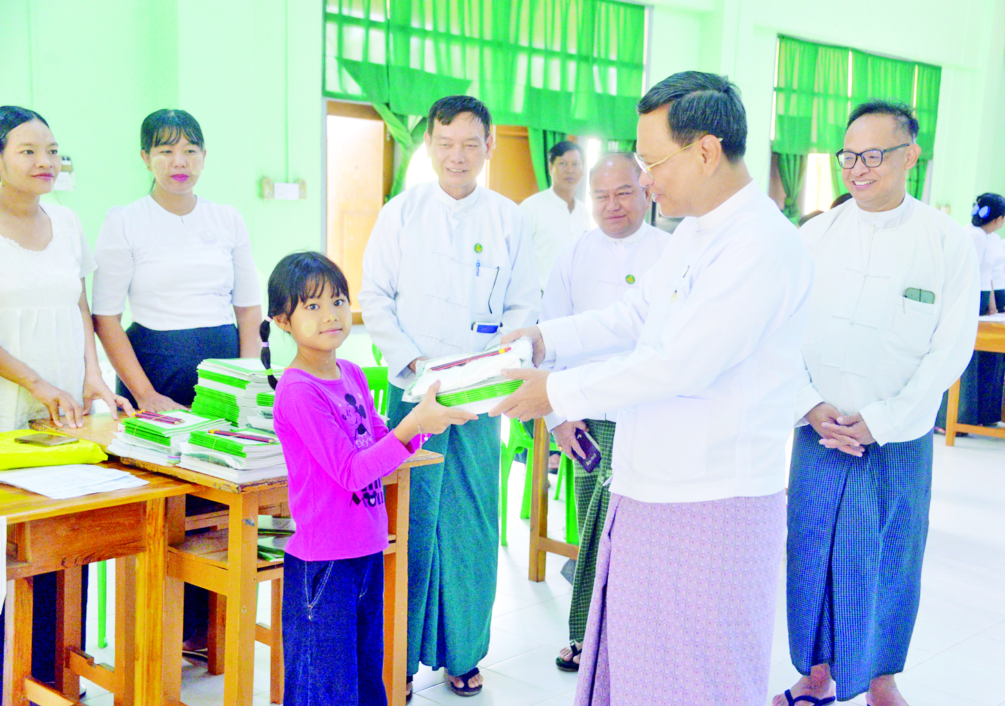 ပညာရေးဝန်ကြီးဌာန ဒုတိယဝန်ကြီး ဒေါက်တာဇော်မြင့်သည် ပညာရေးဝန်ကြီးဌာန ညွှန်ကြား ရေးမှူးချုပ်၊ ဒုတိယအမြဲတမ်းအတွင်းဝန်များနှင့်အတူ ယမန်နေ့ နံနက်ပိုင်းတွင် နေပြည်တော် အမှတ်(၅) အခြေခံပညာအထက်တန်းကျောင်း၊ အမှတ်(၆) အခြေခံပညာအထက်တန်းကျောင်းနှင့် အမှတ်(၁၄) အခြေခံပညာအထက်တန်းကျောင်းများသို့ သွားရောက်၍ ကျောင်းလာရောက်အပ်နှံသည့် မိဘအုပ်ထိန်းသူများနှင့် ကျောင်းသား ကျောင်းသူများ အဆင်ပြေချောမွေ့စွာ ကျောင်း အပ်နှံနိုင်ရေး ဆောင်ရွက်ပေးနေမှု၊ ကျောင်းသား ကျောင်းသူများအတွက် ပြဋ္ဌာန်းပုံနှိပ်စာအုပ်များ၊ ဗလာစာအုပ်များ၊ စာရေးကိရိယာများနှင့် ကျောင်းဝတ်စုံများ တစ်ပါတည်း အခမဲ့ထောက်ပံ့ပေးအပ်နေမှုအခြေအနေများကို လှည့်လည်ကြည့်ရှု စစ်ဆေးပြီး ကျောင်းလာရောက်အပ်နှံကြသည့် ကျောင်းသား ကျောင်းသူများနှင့် ကျောင်းသားမိဘများကို ရင်းရင်းနှီးနှီး လိုက်လံနှုတ်ဆက် အားပေးသည်။