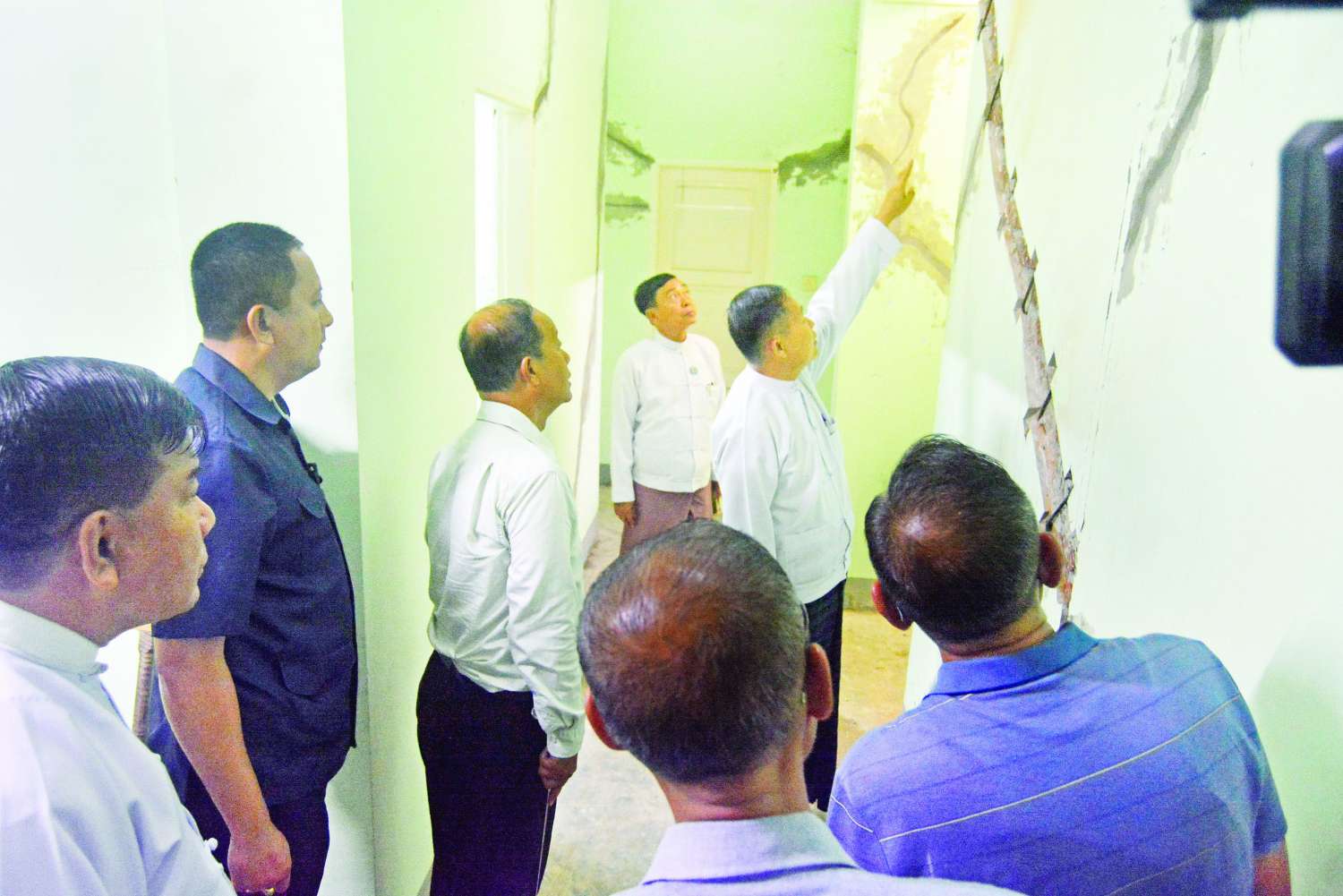 ထို့နောက် နိုင်ငံတော်စီမံအုပ်ချုပ်ရေးကောင်စီဒုတိယဥက္ကဋ္ဌ ဒုတိယဝန်ကြီးချုပ်နှင့် အဖွဲ့ဝင် များသည် သဇင် (၂) အပျိုဆောင်အဆောင်(၁)နှင့် သဇင်(၅) လူပျိုဆောင်အဆောင်(၁၁)တို့၌ ငလျင်ဒဏ်ကြောင့် အနည်းငယ်ထိခိုက်ခဲ့သည့်နံရံများကို ဆောက်လုပ်ရေး လုပ်ငန်းရှင်များအသင်းမှ ဝန်ထမ်းများက Sikalatex ဆေးရည်၊ ကျုံ့ခြင်းမရှိသော ဘိလပ်မြေအခြေခံ ဘက်စုံသုံးဆေးမှုန့် (SikaGrout) နှင့် ဘိလပ်မြေများရောစပ်၍ ကွဲအက်ခဲ့သည့် နေရာများအား ပြန်လည်ပြုပြင်ခြင်းလုပ်ငန်းများ ဆောင်ရွက်နေမှုကို လိုက်လံကြည့်ရှုစစ်ဆေးပြီး လိုအပ်သည်များကို တာဝန်ရှိသူများနှင့် ညှိနှိုင်းဆောင်ရွက်ပေးခဲ့ကြောင်း သတင်းရရှိသည်။