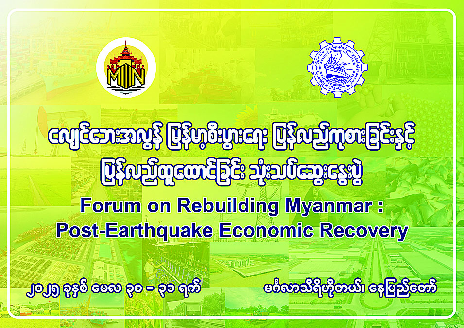ပြန်ကြားရေးဝန်ကြီးဌာနနှင့် စီးပွားရေးနှင့်ကူးသန်းရောင်းဝယ်ရေးဝန်ကြီးဌာနတို့ ကြီးမှူး၍ မြန်မာ့ပုံရိပ်ဖော်ညွှန်းရေးအဖွဲ့(Myanmar Narrative Think Tank) က စီစဉ်ကျင်းပသော “ငလျင်ဘေးအလွန် မြန်မာ့စီးပွားရေးပြန်လည်ကုစားခြင်းနှင့် ပြန်လည်ထူထောင်ခြင်း” (Forum on Rebuilding Myanmar: Post-Earthquake Economic Recovery) သုံးသပ်ဆွေးနွေးပွဲကို မေ ၃၀ ရက်နှင့် ၃၁ ရက်တို့တွင် နေပြည်တော်ရှိ မင်္ဂလာသီရိဟိုတယ်၌ ကျင်းပမည်ဖြစ်သည်။