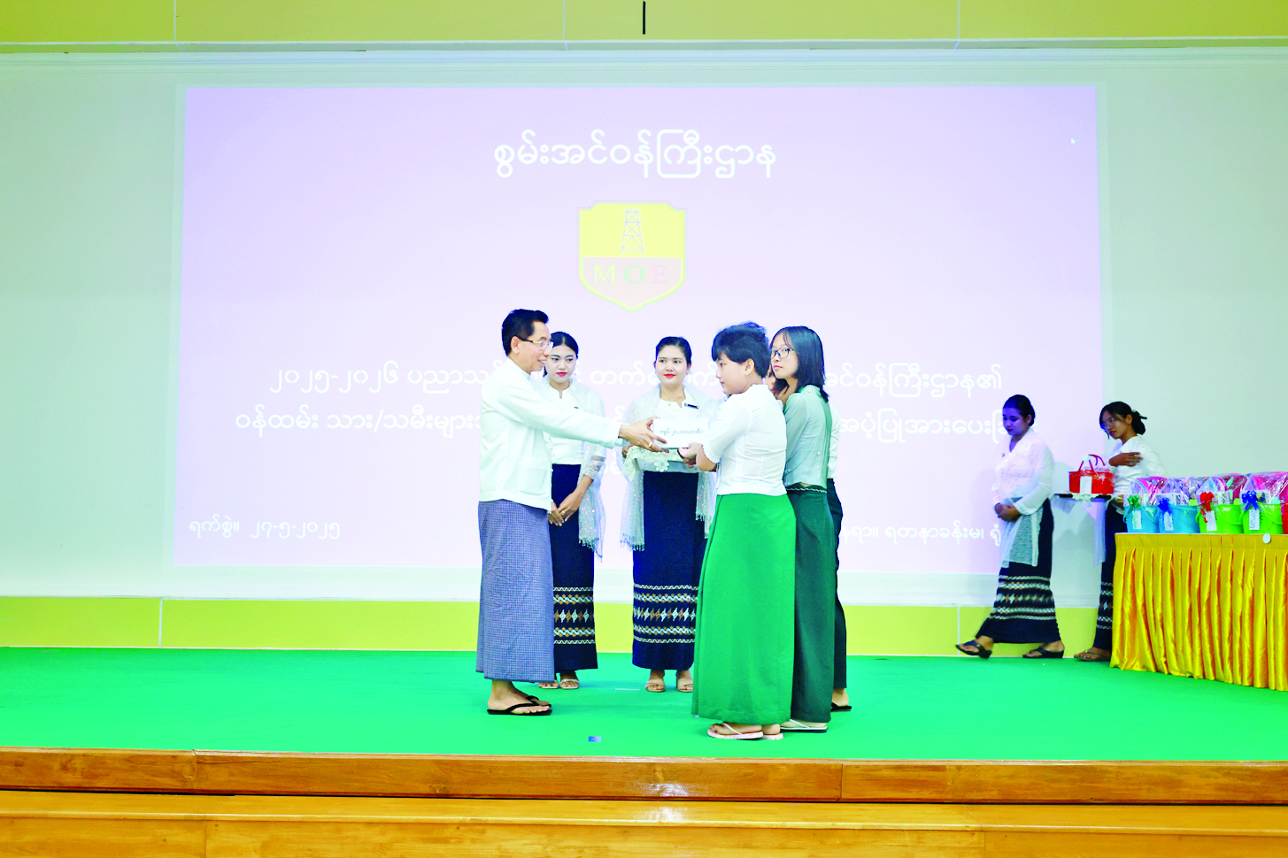 ထို့နောက် ပြည်ထောင်စုဝန်ကြီးနှင့် ဒုတိယဝန်ကြီးတို့က ၂၀၂၅-၂၀၂၆ ပညာသင်နှစ်တွင် မူကြိုမှ Grade -12 အထိ တက်ရောက်ကြမည့် ကျောင်းသား ကျောင်းသူများအား ကျောင်းသုံးပစ္စည်းများနှင့် ပညာသင်ထောက်ပံ့ကြေးများ ပေးအပ်သည်။