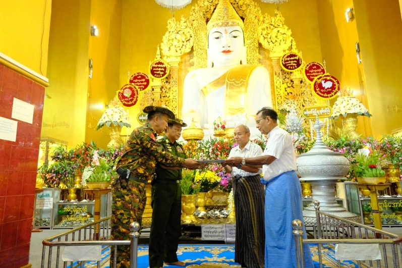အလားတူ ကာကွယ်ရေးဦးစီးချုပ်ရုံး (ကြည်း) မှ ဒုတိယဗိုလ်ချုပ်ကြီး စိုးတင့်နိုင်နှင့် တာဝန်ရှိသူများသည် မန္တလေးမြို့၊ အမရပူရမြို့နယ်၊ သမိုင်းဝင်အောင်မြေရွှေကြက်ကျ ဆုတောင်းပြည့်မြတ်စွာဘုရားသို့ သွားရောက်၍ ငလျင်ဒဏ်ကြောင့် ထိခိုက်ပျက်စီးခဲ့သော အပျက်အစီးများ ပြန်လည်ပြုပြင်မွန်းမံတည်ဆောက်နေမှု အခြေအနေများအား လိုက်လံကြည့်ရှုစစ်ဆေးပြီး တာဝန်ရှိသူများအား လိုအပ်သည်များ ပေါင်းစပ်ညှိနှိုင်းဆောင်ရွက်ပေးသည်။