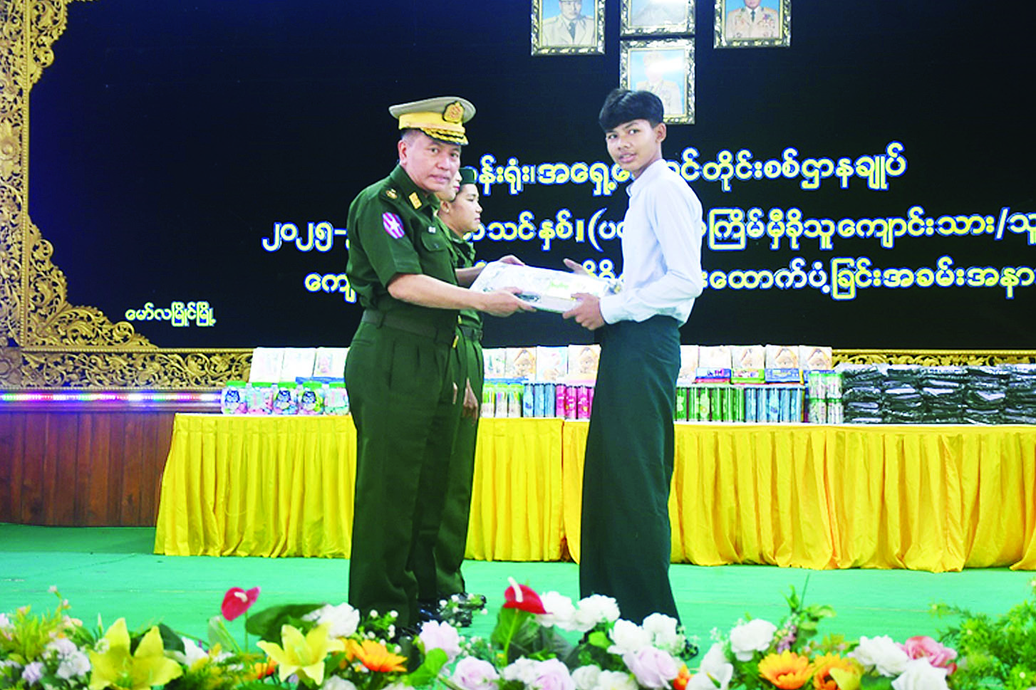 အလားတူ ၂၀၂၅-၂၀၂၆ ပညာသင်နှစ်တွင် တက်ရောက်ပညာသင်ကြားကြမည့် အလယ်ပိုင်းတိုင်းစစ်ဌာနချုပ်နှင့် အဆင့်မြင့်စစ်မှုထမ်းဟောင်း အိမ်ရာ (မန္တလေး) ရှိ မိသားစုဝင် ကျောင်းသား ကျောင်းသူများအား ပညာသင်စရိတ်၊ ကျောင်းဝတ်စုံနှင့် စာရေးကိရိယာများ ပေးအပ်ခြင်းကို ယနေ့တွင် အလယ်ပိုင်းတိုင်း စစ်ဌာနချုပ် ရန်အောင်မြင်ခန်းမ၌ ပြုလုပ်ရာ တိုင်းမှူး ဗိုလ်မှူးချုပ် ကျော်ကိုထိုက်နှင့် တာဝန်ရှိသူများ၊ အရာရှိ၊ စစ်သည်၊ မိသားစုဝင်များ၊ စစ်မှုထမ်းဟောင်းအဖွဲ့ဝင်များ၊ ဆရာ ဆရာမများနှင့် ကျောင်းသား ကျောင်းသူများ တက်ရောက်ကြသည်။