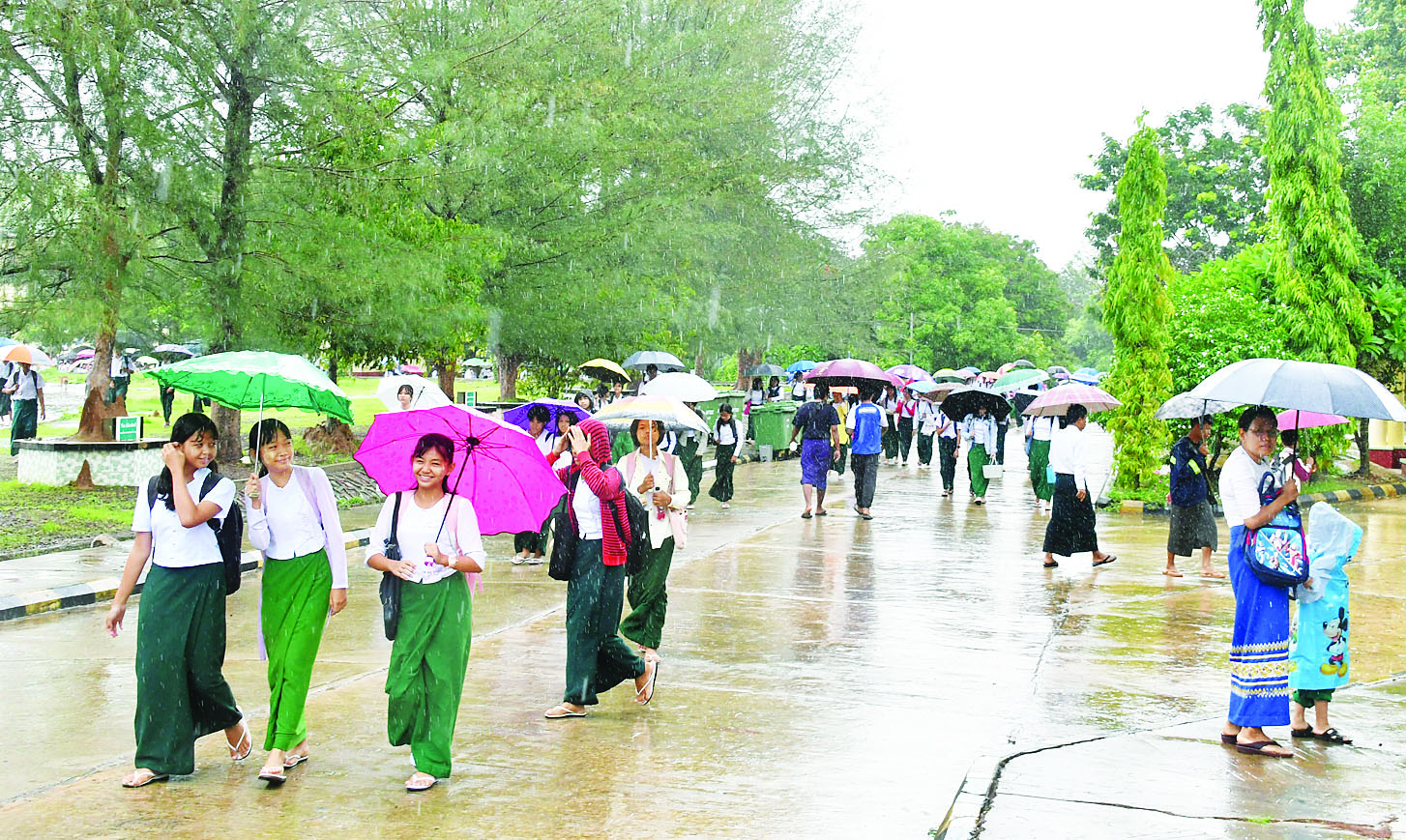 ယနေ့ အခြေခံပညာကျောင်းများ စတင်ဖွင့်လှစ်ခြင်းနှင့်စပ်လျဉ်း၍ အမှတ်(၅) အခြေခံပညာအထက်တန်းကျောင်းမှ ကျောင်းအုပ်ဆရာကြီး ဦးဝင်းမြင့်ဦးက “ဒီနှစ် ကျောင်းသား ကျောင်းသူအပ်နှံစာရင်း ၂၁၁၉ ဦးရှိပါတယ်။ မနှစ်က ကျောင်းသားဦးရေနဲ့ နှိုင်းယှဉ်ရင် ၁၇ ရာခိုင်နှုန်းလောက် ကွာဟမှုရှိပေမယ့် ကျောင်းအပ်လက်ခံနေသေးတဲ့အတွက် ရာခိုင်နှုန်းပြည့်မီမယ်လို့ ခန့်မှန်းပါတယ်။ မနက် ၈ နာရီခွဲ ကျောင်းတက်မှာဖြစ်ပြီး ညနေ ၃ နာရီ ၄၅ မိနစ် ကျောင်းဆင်းမှာဖြစ်တဲ့အတွက် တစ်ချိန်တက်ကျောင်းဖြစ်ပါတယ်။ အရင်နှစ်တွေမှာ ကျောင်း အကြို၊ အပို့ ကားတွေကို လမ်းကြောင်းငါးကြောင်း ပြေးဆွဲပါတယ်။ ဒီနှစ်မှာတော့ မန္တလေးငလျင်ကြောင့် မိဘတွေ ရွှေ့ပြောင်းနေထိုင်ကြရတဲ့အတွက် လမ်းကြောင်းသုံးကြောင်းပြေးဆွဲပြီး ကားအစီးရေ ထပ်မံဖြည့်တင်းသွားမှာဖြစ်ပါတယ်။ သင်ရိုးညွှန်းတမ်းနဲ့ ညွှန်ကြားချက်အရ အတန်းအချိန်ဇယားတွေမှာ စာဖတ်ချိန်နဲ့ ဥပဒေဘာသာရပ်အပါအဝင် စာသင်ချိန် ရှစ်ချိန်ထည့်သွင်းရေးဆွဲထားပါတယ်။ နိုင်ငံသားတိုင်း အသက် ၁၈ နှစ်ပြည့်ပြီးရင် နိုင်ငံတော်ရဲ့ ဥပဒေအကြောင်းအရာကို သိရှိရမှာဖြစ်တဲ့အတွက် ဥပဒေဘာသာရပ်ကို အထက်တန်းအဆင့် Grade -11 နဲ့ Grade -12 အတွက် ထည့်ဆွဲထားပါတယ်။ အခမဲ့ပညာရေးစနစ်ဖြစ်တဲ့အတွက် မိဘတိုင်းက မိမိတို့ရဲ့ သား၊ သမီးများကို နီးစပ်ရာ ကျောင်းတွေမှာ ကျောင်းအပ်နှံကြပါလို့ တိုက်တွန်းချင်ပါတယ်”ဟု ပြောကြားသည်။
