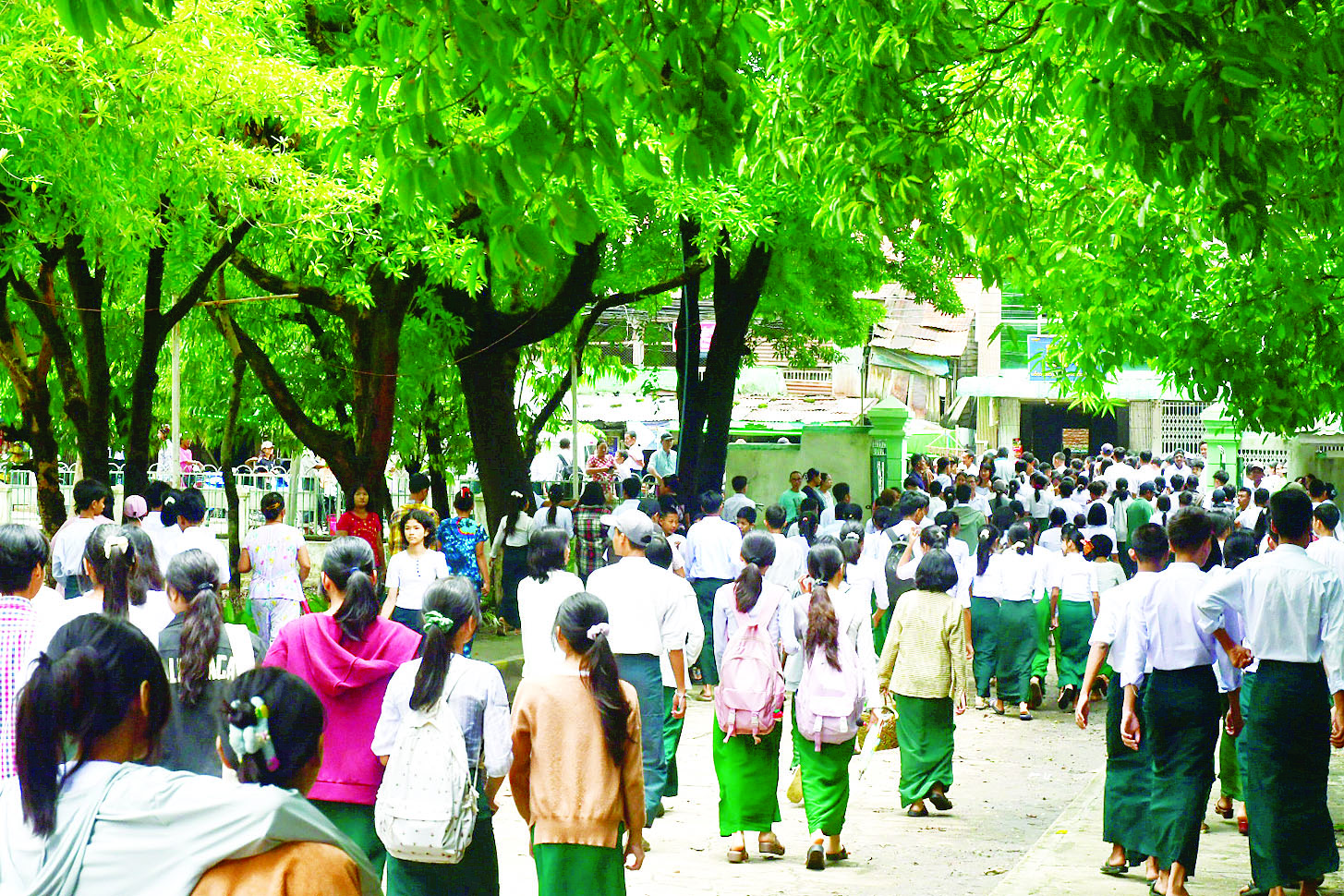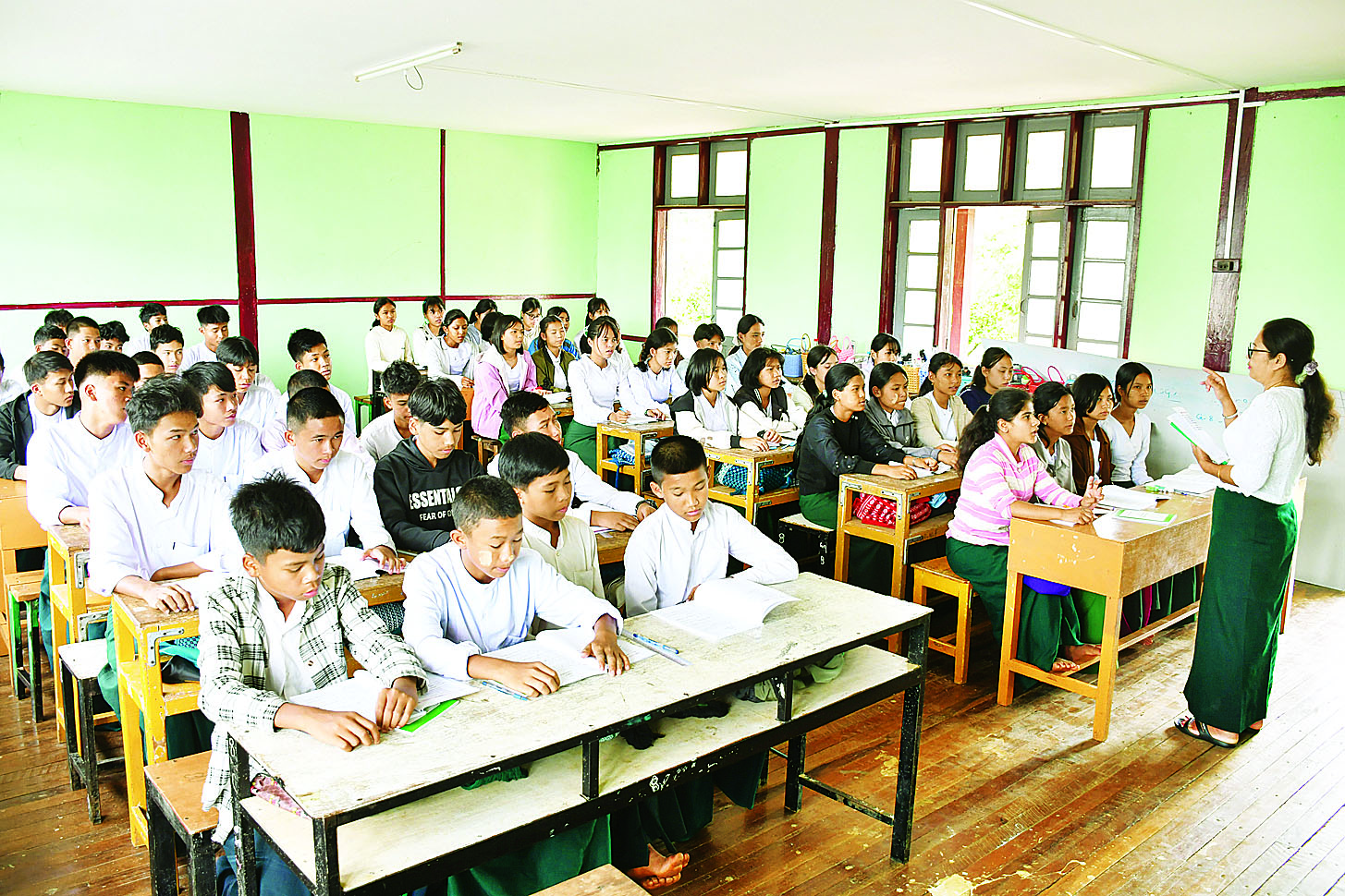 ၂၀၂၅-၂၀၂၆ ပညာသင်နှစ်မှာတော့ ကျွန်မတို့ကျောင်းမှာ ကျောင်းသားဦးရေ ၁၅၂၀ တက်ရောက်နေပါတယ်။ မနှစ်ကကျောင်းသားဦးရေကို ပြည့်မီဖို့တော့ ၁၀၀ကျော် လိုပါသေးတယ်။ ဒီဇွန်လကုန်မှာတော့ ယခင်နှစ်က ကျောင်းသားဦးရေအတိုင်း ပြည့်မီမယ်လို့ ခန့်မှန်းထားရှိပါတယ်။ ဘာသာရပ်ခွဲဝေ မှုအနေနဲ့ကတော့ ကျွန်မတို့က တစ်နေ့ကို စာသင်ချိန် ရှစ်ချိန်နဲ့ တစ်ပတ်ကိုစာသင်ချိန် အချိန်ပေါင်း ၄၀ နဲ့ သင်ကြားပို့ချပေးပါတယ်။ အလယ်တန်းအဆင့် ကျောင်းသား ကျောင်းသူတွေမှာတော့ တစ်ပတ် တစ်ကြိမ် စာဖတ်ချိန်ဆိုပြီးတော့ ကျောင်းသားလူငယ်တွေရဲ့ အသိပညာမြင့်မားဖို့အတွက် စာကြည့်တိုက်မှာ စာဖတ်ချိန်အဖြစ် စာဖတ်ရှိန်မြှင့်တင်ရေးလုပ်ငန်းတွေကို ဆောင်ရွက်လျက်ရှိပါတယ်။ အထက်တန်းအဆင့်မှာတော့ ကျွန်မတို့က ကျောင်းသားလူငယ်တွေဟာ အရင်တုန်းက စနစ်ဟောင်းပညာရေးမှာကျတော့ ကျွန်မတို့က ဆယ်တန်းကို အသက် ၁၆ နှစ်မှာ အောင်မြင်ပါတယ်။ အခုစနစ်သစ်ပညာရေးသည် အသက်၁၈နှစ်မှာ Grade-12 ကို အောင်မြင်မှာဖြစ်တဲ့အတွက် အသက် ၁၈ နှစ်ဖြစ်တဲ့ ဒီကျောင်းသား လူငယ်တွေဟာ ကျောင်းသားတွေရဲ့ အခွင့်အရေး၊ နိုင်ငံသားတိုင်းရဲ့ အခွင့်အရေးဟာ မဲပေးပိုင်ခွင့်ဆန္ဒရှိတဲ့ ကျောင်းသားလူငယ်တွေ အခြေခံပညာရေးကဏ္ဍမှာ ပါဝင်လာပါတယ်။ ဒါကြောင့် ကျွန်မတို့က ကျောင်းသားလူငယ်တွေကို သူတို့ရဲ့အခွင့်အရေးတွေ၊ နိုင်ငံသားတိုင်းရဲ့ အခွင့်အရေးတွေ၊ ဥပဒေအကြောင်းအရာတွေကို သိဖို့အတွက် တစ်ပတ်စာ သင်ချိန် တစ်ချိန်ကို ဥပဒေရေးရာချိန်အဖြစ် ထည့်သွင်းသင်ကြားပေးလျက်ရှိပါတယ်။ ဥပဒေရေးရာအချိန်မှာတော့ နိုင်ငံတော်ဖွဲ့စည်းပုံအခြေခံဥပဒေအကြောင်းတွေကို သင်ကြားပေးပါတယ်။ နောက်ပြီး ယာဉ်စည်းကမ်း၊ လမ်းစည်းကမ်း၊ နိုင်ငံသားတိုင်းလိုက်နာရမယ့် စည်းမျဉ်းစည်းကမ်းတွေအားလုံးကို သင်ကြားပေးနေပါတယ်ရှင်။