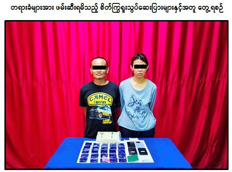 မူးယစ်ဆေးဝါးတားဆီးနှိမ်နင်းရေးရဲတပ်ဖွဲ့မှ တပ်ဖွဲ့ဝင်များပါဝင်သော ပူးပေါင်းအဖွဲ့သည် ဇွန်လ ၂ ရက်နေ့ ညနေ ၄ နာရီခွဲအချိန် တာချီလိတ်မြို့၊ ပုန်းထွန်ရပ်ကွက်၊ နယ်မြေ(၂)၊ ဟွေနမ့်လင်း ကျေးရွာရှိ ဒေါ်နန်းကော့၏ခြံဝင်း၌ ထိုင်းနိုင်ငံမှ အလိုရှိတရားခံပြေးများ ငှားရမ်းနေထိုင်လျက်ရှိကြောင်း သတင်းအရ ဝင်ရောက်ရှာဖွေခဲ့ရာ ထိုင်းနိုင်ငံမှ မူးယစ်မှုဖြင့်အလိုရှိတရားခံပြေး Mr. Phanatsak Riabpuang (ဖနပ်ဆက်ရိဖောင်း)နှင့် Miss.Wanida Jakkeaw (ဝနိဒါကျတျောက်)တို့ ၂ ဦးအား စိတ်ကြွရူးသွပ်ဆေးပြား ၁၁,၀၀၀ ပြားနှင့်အတူ ဖမ်းဆီးရမိသဖြင့် ၎င်းတို့ ၂ ဦးအား ဥပဒေအရ အရေးယူထားရှိပြီး ကွင်းဆက်ပြစ်မှု ကျူးလွန်သူများအား ဆက်လက်ဖော်ထုတ်လျက်ရှိကြောင်း မြန်မာနိုင်ငံရဲတပ်ဖွဲ့မှ သတင်းရရှိသည်။