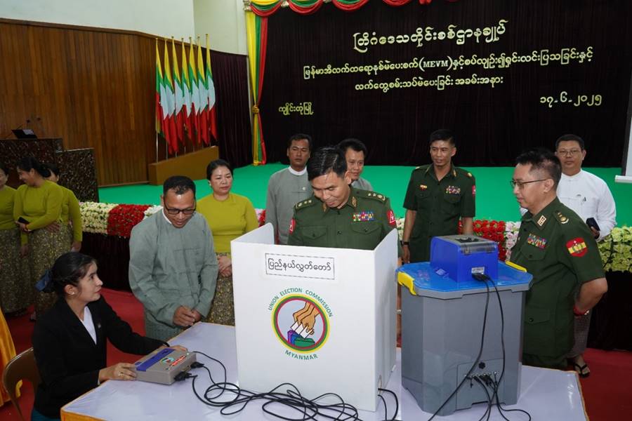 မြန်မာအီလက်ထရောနစ်မဲပေးစက်(MEVM)နှင့်စပ်လျဉ်း၍ ရှင်းလင်းပြသခြင်းနှင့် မဲပေးစက်လက်တွေ့သရုပ်ပြမဲပေးခြင်းကို ယနေ့ညနေပိုင်းတွင် တြိဂံဒေသတိုင်းစစ်ဌာနချုပ်၊ ပြည်ငြိမ်းအေးခန်းမ၌ပြုလုပ်ရာ တိုင်းမှူး ဗိုလ်မှူးချုပ် စိုးလှိုင်နှင့် တာဝန်ရှိသူများ၊ အရာရှိ၊ စစ်သည်၊ မိသားစုများ၊ ဖိတ်ကြားထားသူများ တက်ရောက်ကြသည်။