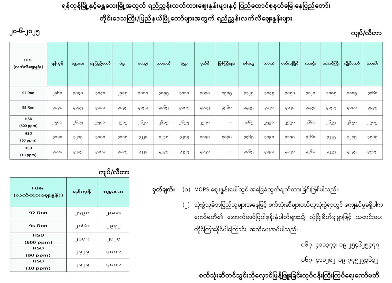 ရန်ကုန်မြို့နှင့် မန္တလေးမြို့အတွက် ရည်ညွှန်းလက်ကားဈေးနှုန်းများနှင့် ပြည်ထောင်စုနယ်မြေ နေပြည်တော်၊ တိုင်းဒေသကြီး/ ပြည်နယ် မြို့တော်များအတွက် ရည်ညွှန်းလက်လီဈေးနှုန်းများ 06/20/2025