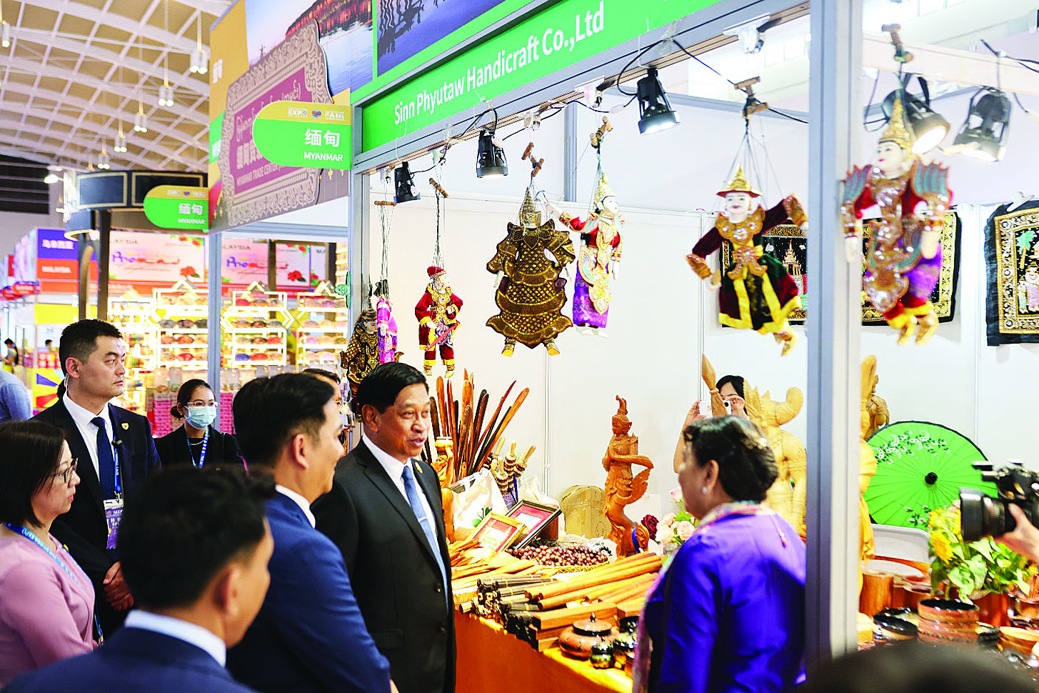 ယင်းနောက် မြန်မာ့ပြခန်းဆောင်၌ ခင်းကျင်းပြသထားသော မြန်မာ့ထုတ်ကုန်ပစ္စည်းများကို လှည့်လည်ကြည့်ရှုအားပေးကာ ကုန်သည်လုပ်ငန်းရှင်များနှင့်တွေ့ဆုံ၍ မြန်မာ့ထုတ်ကုန်များကို ဒေသတွင်းနှင့် နိုင်ငံတကာဈေးကွက်သို့ ပိုမိုတင်ပို့နိုင်ရေးအတွက် တရုတ်-တောင်အာရှ ကုန်စည်ပြပွဲ ပလက်ဖောင်း (Platform)ကို ထိထိရောက်ရောက် အသုံးချရန်မှာကြားသည်။