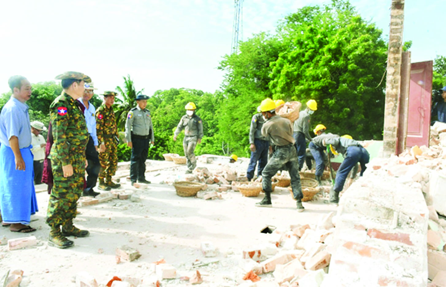 ထိုသို့ဆောင်ရွက်ပေးလျက်ရှိရာ ယနေ့တွင် ကာကွယ်ရေးဦးစီးချုပ်ရုံး(ကြည်း)မှ ဒုတိယဗိုလ်ချုပ်ကြီးသက်ပုံနှင့် တာဝန်ရှိသူများသည် စစ်ကိုင်းတိုင်းဒေသကြီး စစ်ကိုင်းမြို့အတွင်းရှိ ဆွမ်းဦးပုညရှင် စေတီတော်နှင့် လေးကျွန်းမာရ်အောင်မြတ်စွာဘုရားတို့၌ ငလျင်အတွင်း ထိခိုက်ပျက်စီးခဲ့သော သာသနိကအဆောက်အအုံများအား အဖွဲ့အစည်းအသီးသီးက ဒေသခံပြည်သူများနှင့်ပူးပေါင်း၍ အပြီးသတ်ဖယ်ရှားရှင်းလင်းပြီး စေတီတော်ရင်ပြင်တိုးချဲ့ရန် မြေသားခိုင်မာမှုစမ်းသပ်စစ်ဆေးခြင်းနှင့် စေတီတော်လုံးပတ် ပြန်လည်ပြုပြင်မွမ်းမံတည်ဆောက်နေမှု၊ စေတီတော်ပရိဝုဏ်အတွင်း သန့်ရှင်းသာယာလှပရေးနှင့် ဘက်စုံပြန်လည်ပြုပြင်တည်ဆောက်နေမှု၊ စစ်ကိုင်းမြို့အတွင်းရှိ ငလျင်ဒဏ်သင့်ဘုန်းတော်ကြီးကျောင်းတိုက်များ၊ သာသနာ့နွယ်ဝင်သီလရှင် စာသင်တိုက်များ၊ သာသနိကအဆောက်အုံများနှင့် နေအိမ်အဆောက်အုံများ၌ အပျက်အစီးများကို စက်ယန္တရားကြီးများအသုံးပြု၍ အပြီးသတ်ဖယ်ရှားရှင်းလင်းမှုနှင့် ပြန်လည်တည်ဆောက်ရေး ဆောင်ရွက်နေမှုများကို ကြည့်ရှုစစ်ဆေး၍ လိုအပ်သည်များမှာကြားပြီး လုပ်ငန်းဆောင်ရွက်နေကြသူများအား အားဖြည့်အချိုရည်များ ပေးအပ်သည်။