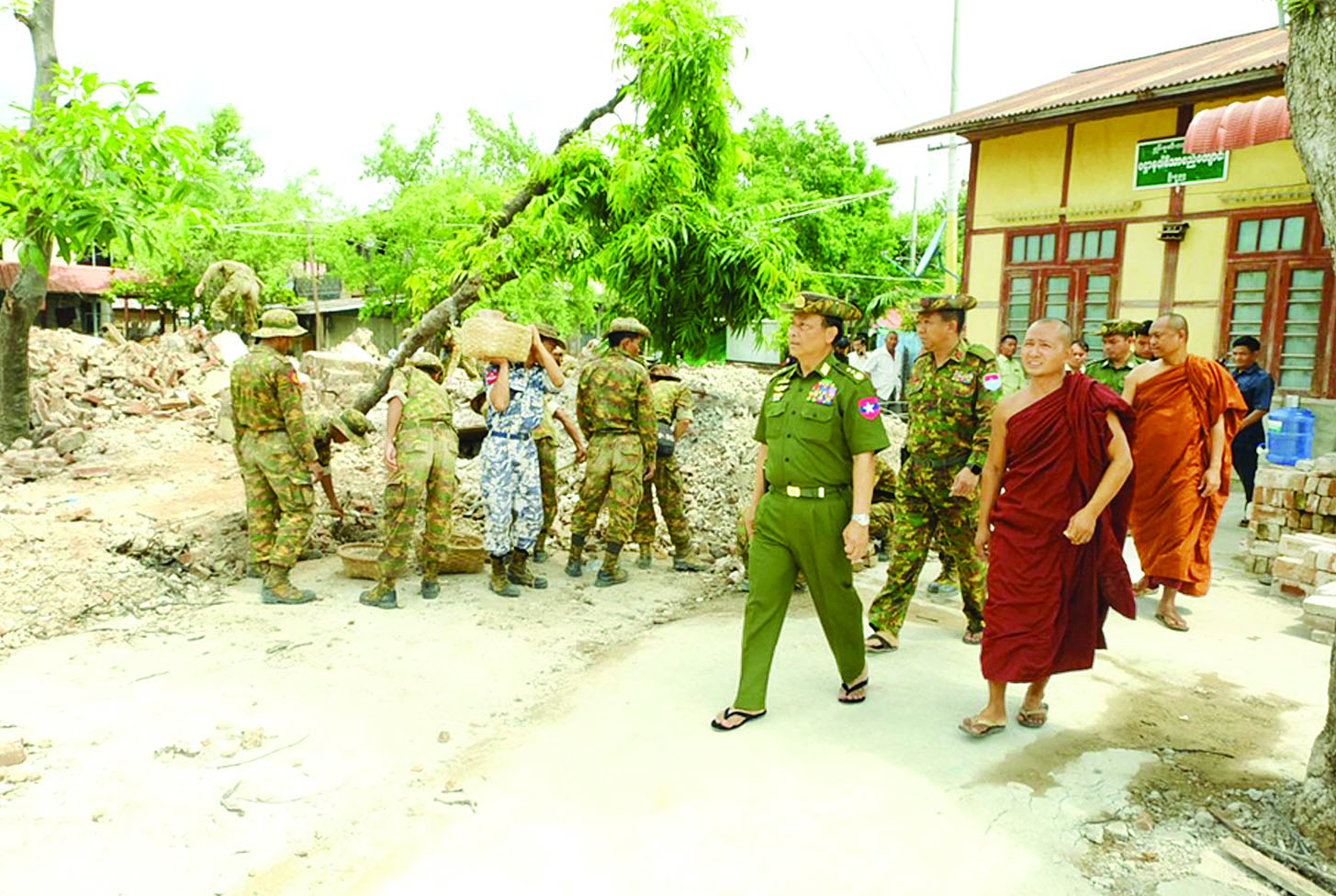 အလားတူ ကာကွယ်ရေးဦးစီးချုပ်ရုံး(ကြည်း)မှ ဒုတိယဗိုလ်ချုပ်ကြီး စိုးတင့်နိုင်နှင့် တာဝန်ရှိသူများသည် မန္တလေးမြို့ချမ်းမြသာစည်မြို့နယ် ချမ်းမြသာစည်တောင်ရပ်ကွက် ရှမ်းစုဆီးဘန်နီတိုက်အတွင်းရှိ အလယ်တိုက်ကြီးအုတ်ကျောင်းနှင့် ကျွန်းလုံးဥသျှောင်ရပ်ကွက် ဒက္ခိဏာရာမဘုရားကြီး ကျောင်းတိုက်ရှိ သာသနာ့ဇောတိကာရုံအုဋ်ကျောင်း တို့၌ ငလျင်ဒဏ်ကြောင့် ထိခိုက်ပျက်စီးခဲ့သော အပျက်အစီးများကို တပ်မတော်သားများက လည်းကောင်း၊ စက်ယန္တရားကြီးများအသုံးပြု၍ လည်းကောင်း အင်တိုက်အားတိုက် ဖယ်ရှားရှင်းလင်းနေမှုနှင့် ချမ်းမြသာစည်မြို့နယ် ကန်သာယာရပ်ကွက်နှင့် မြို့သစ်အမှတ်(၃) ရပ်ကွက်တို့ရှိ အန္တရာယ်ရှိ နေအိမ် အဆောက်အအုံအပျက်အစီးများအား စက်ယန္တရားကြီးများ အသုံးပြု၍ ဖယ်ရှားရှင်းလင်းနေမှုတို့ကို ကြည့်ရှုစစ်ဆေးပြီး လိုအပ်သည်များ ပေါင်းစပ်ညှိနှိုင်းဆောင်ရွက်ပေးခဲ့ကြောင်း သတင်းရရှိသည်။