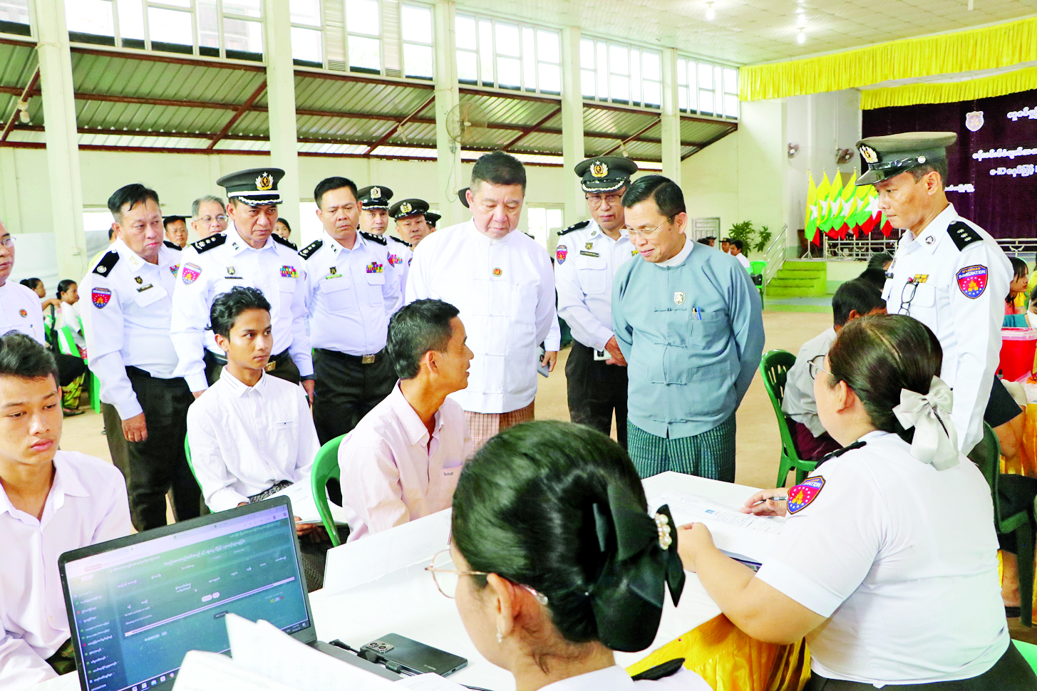 ဆက်လက်၍ နိုင်ငံသားစိစစ်ရေးကတ်ပြားရရှိ ပြီးသူများအား e-ID စနစ်ဖြင့် ကိုယ်ရေးအချက်အလက်(Biographic)နှင့် ဇီဝဆိုင်ရာအချက်အလက် (Biometric)ကောက်ယူပြီး ဂဏန်း (၁၀)လုံးပါ (Unique ID) နံပါတ်ထုတ်ပေးနေမှုနှင့် မြို့နယ်ရုံးအတွင်း စာရွက်စာတမ်းများနှင့် ရုံးသုံးပစ္စည်းများ ထိန်းသိမ်းထားရှိမှုနှင့် မှတ်တမ်းခန်းအတွင်း ကိုယ်ရေးဖိုင်များ စနစ်တကျထိန်းသိမ်းထားရှိမှုတို့ကို လှည့်လည်ကြည့်ရှုစစ်ဆေးကာ ပြည်ထောင်စုဝန်ကြီးက ရုံးစာရွက်စာတမ်းများ၊ e-ID စနစ်ဆိုင်ရာစက်ပစ္စည်း၊ ရုံးသုံးပစ္စည်းများနှင့် ကိုယ်ရေးဖိုင်များ စနစ်တကျလုံခြုံစွာ ထိန်းသိမ်းထားရှိဆောင်ရွက်ရေး၊ မီးဘေးအန္တရာယ်နှင့်ပိုးမွှားအန္တရာယ် ကြိုတင် ကာကွယ်တားဆီးဆောင်ရွက်ရေး၊ စက်ပစ္စည်းများနှင့် ကိုယ်ရေးဖိုင်များအတွက်ထုတ်၊ သွင်းမှုမှတ်တမ်းများ စနစ်တကျရေးသွင်း ဆောင်ရွက်ကြရေးမှာကြားကာ တာဝန်ရှိသူများ၏ ရှင်းလင်းတင်ပြချက်များအပေါ် လိုအပ်သည်များ ညှိနှိုင်းဖြည့်ဆည်းဆောင်ရွက်ပေးသည်။
