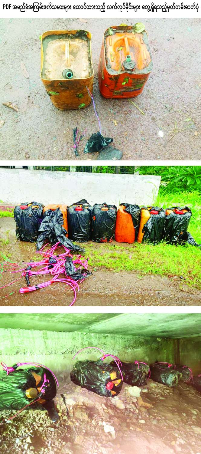 ထိုသို့ လုပ်ဆောင်လျက်ရှိရာ ယနေ့နံနက်ပိုင်းတွင် ကျိုက်ထိုမြို့၏ အနောက်မြောက်ဘက် မီတာ ၁၃၀၀၀ ခန့်အကွာ အင်္ဂပိုကျေးရွာအနီး ရန်ကုန်-မော်လမြိုင်သွား ပြည်ထောင်စုကားလမ်းမကြီးပေါ်၌ PDF အမည်ခံအကြမ်းဖက်သမားများက ငါးဂါလန်ပုံးများဖြင့် ပြုလုပ်ထားသည့် ဒေသန္တရလက်လုပ်မိုင်း နှစ်လုံးအားလည်းကောင်း၊ အဆိုပါ ပြည်ထောင်စုလမ်း၏ မိုင်တိုင်အမှတ် (၉၄/၇)အနီး တံတားအမှတ် (၃/၉၅)နေရာရှိ တံတားအောက်ခြေတွင် ငါးဂါလန်ပုံးများဖြင့်ပြုလုပ်ထားသည့် ဒေသန္တရလက်လုပ်မိုင်းခုနစ်လုံးနှင့် မိုင်တိုင်အမှတ်(၉၄/၃) နေရာ၌ ငါးဂါလန်ပုံးများဖြင့် ပြုလုပ်ထားသည့် ဒေသန္တရလက်လုပ်မိုင်း နှစ်လုံးတို့အားလည်းကောင်း စုစုပေါင်းဒေသန္တရလက်လုပ်မိုင်း ၁၁ လုံးတို့အား ဆင်ခြင်တုံတရားမဲ့စွာ မိုင်းထောင်ထားသည်ကို လုံခြုံရေးတပ်ဖွဲ့ဝင်များက ရှာဖွေတွေ့ရှိခဲ့သဖြင့် အများပြည်သူများ အသက်အန္တရာယ်မဖြစ်ပေါ်စေရေး စနစ်တကျ ဖယ်ရှားရှင်းလင်းခဲ့ရသည်။