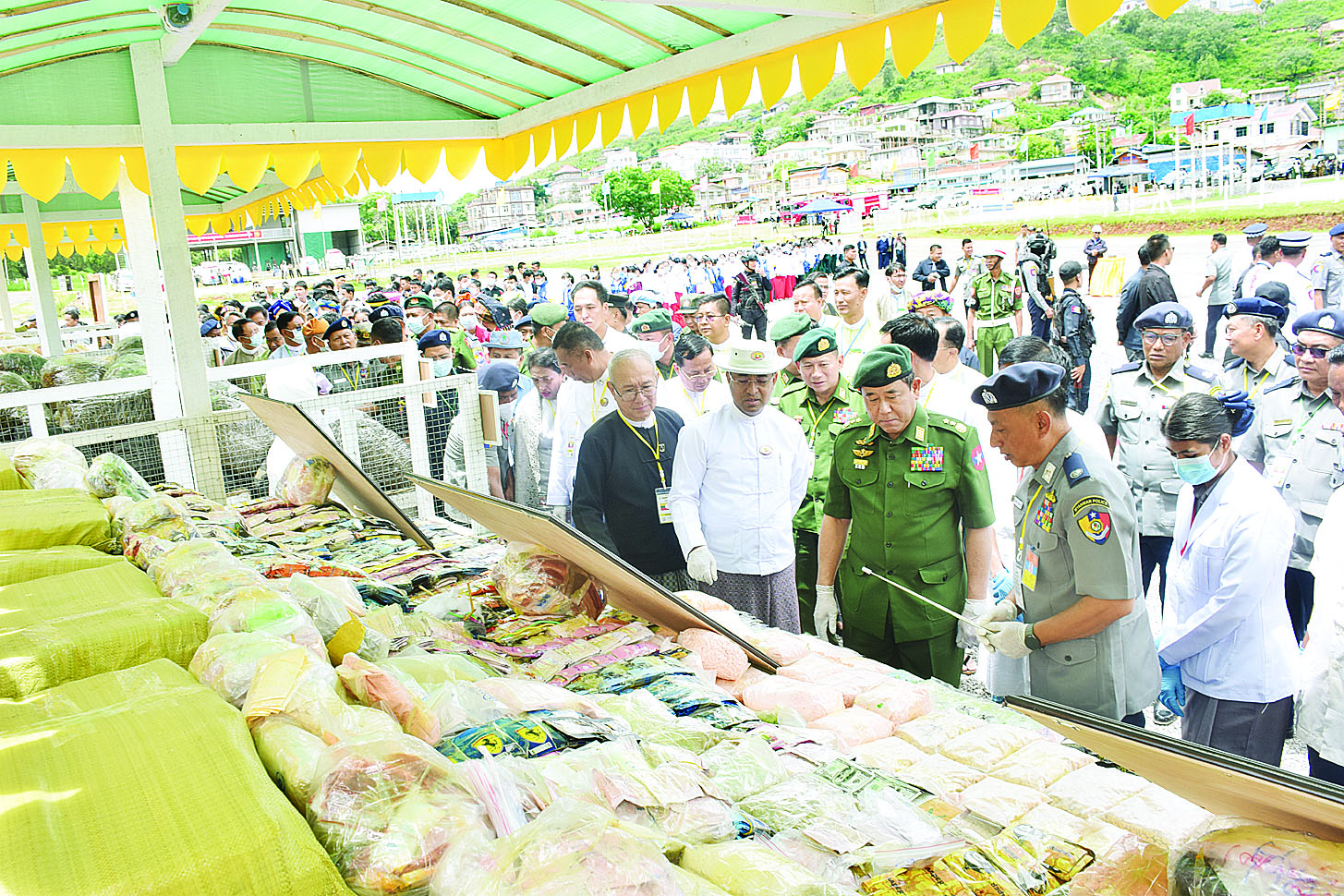 အပြည်ပြည်ဆိုင်ရာ မူးယစ်ဆေးဝါးအလွဲသုံးမှုနှင့် တရားမဝင်ရောင်းဝယ်မှုတိုက်ဖျက်ရေးနေ့ အထိမ်းအမှတ်အခမ်းအနားများကို ယနေ့တွင် နေပြည်တော်ကောင်စီနယ်မြေ၊ တိုင်းဒေသကြီး/ ပြည်နယ်များတွင် ကျင်းပပြီး တောင်ကြီး၊ ရန်ကုန်နှင့် မန္တလေးမြို့တို့တွင် တစ်နှစ်တာကာလအတွင်း ဖမ်းဆီးရမိမူးယစ်ဆေးဝါးများ၊ ဓာတုပစ္စည်းများ ဖျက်ဆီးခြင်းကို ကျန်းမာရေးဝန်ကြီးဌာနမှ ထုတ်ပြန်ထားသည့် ကိုဗစ်-၁၉ ရောဂါဆိုင်ရာ ညွှန်ကြားချက်များနှင့်အညီ ကျင်းပကာ မူးယစ်ဆေးဝါးတားဆီးနှိမ်နင်းရေးလုပ်ငန်းများတွင် ထူးချွန်စွာ စွမ်းစွမ်းတမံဆောင်ရွက်ခဲ့ကြသူများကို ဆုများချီးမြှင့်ကြသည်။